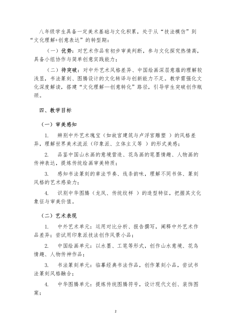 (新)人美版八年级初二上册美术教学计划晨晨老师2个月前发布关注私信27.28KB10页0338 以下为资料部分截图预览,下载后为超高清原文件。 第1页 / 共10页 第2页 / 共10页 试读已结束,还剩8页,您可下载完整版后进行离线阅读 加入VIP,享海量教务资料,无限制免费下载所有材料 (新)人美版八年级初二上册美术教学计划此内容为付费资源,请付费后查看¥9.99¥15.99VIP会员免费代理(享70%分佣)免费立即购买您当前未登录!建议登陆后购买,可保存购买订单付费资源© 版权声明文章版权归作者所有,未经允许请勿转载。THE END教研计划 文本预览 人美版八年级上册美术教学计划一、指导思想以《义务教育艺术课程标准(2022年版)》为指引,聚焦美术学科核心素养(审美感知、艺术表现、创意实践、文化理解),依托教材单元主题,开展中外艺术瑰宝探寻、中国绘画品鉴、书法篆刻深究、中华图腾传承、传统文化推广等教学。通过欣赏、探究、创作活动,提升学生艺术审美与文化解读能力,厚植文化自信,培养创新思维与实践能力,助力学生以美术为媒,传承文化、对话世界。二、教材分析人美版八年级上册美术教材设“探寻中外艺术瑰宝”“中国绘画的独特意蕴”“书法和篆刻的深层魅力”“古为今用的‘中华图腾’”“让传统文化走向世界”5个单元,覆盖四大学习领域:(一)探寻中外艺术瑰宝:借“故官遇上卢浮官”“缤纷的世界美术流派”,搭建中外艺术对话桥梁,拓展审美视野:(二)中国绘画的独特意蕴:以“山水相逢”“花鸟为伴”“传神写照”,深挖中国绘画意境、笔墨与传神之美,传承传统艺术精神;(三)书法和篆刻的深层魅力:从“翰墨菁华”“方寸天地”“字载古今”,深化对书法篆刻艺术语言、文化内涵的理解:(四)古为今用的“中华图腾”:通过“提炼民族符号”“彰显文化传承”,激活传统图腾当代价值,衔接设计应用:(五)让传统文化走向世界:以“以家乡之名”“文创中的神州风貌”,推动传统文化创意转化与国际传播,落实综合探索。各单元梯度推进,既强化传统艺术根基,又赋能文化创新实践,契合八年级学生文化认知深化与审美思辨提升需求。三、学情分析 查看更多 收起部分 喜欢就支持一下吧点赞8 分享QQ空间微博QQ好友海报分享复制链接收藏