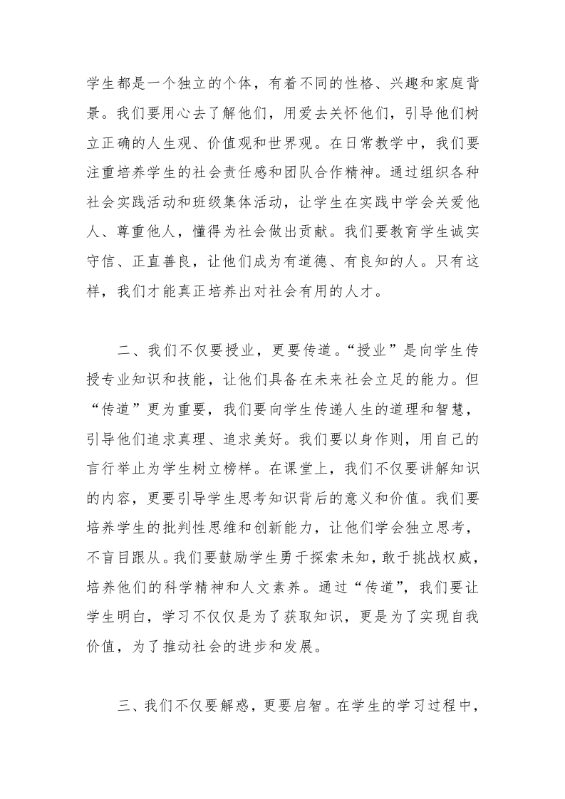 在2025年教师节大会教师代表发言晨晨老师2个月前发布关注私信14.01KB5页04415 以下为资料部分截图预览,下载后为超高清原文件。 第1页 / 共5页 第2页 / 共5页 试读已结束,还剩3页,您可下载完整版后进行离线阅读 加入VIP,享海量教务资料,无限制免费下载所有材料 在2025年教师节大会教师代表发言此内容为付费资源,请付费后查看¥9.99¥15.99VIP会员免费代理(享70%分佣)免费立即购买您当前未登录!建议登陆后购买,可保存购买订单付费资源© 版权声明文章版权归作者所有,未经允许请勿转载。THE END演讲讲话 文本预览 在2025年教师节大会教师代表发言尊敬的各位领导、亲爱的同仁们:大家好!在这金秋送爽、硕果累累的美好时节,我们怀着无比喜悦与自豪的心情,齐聚在这充满希望与梦想的校园,共同庆祝第41个教师节。此刻,校园里弥漫着的书香气息,恰似我们教育事业散发的独特芬芳,而那秋风中摇曳的金桂,就如同我们悉心培育的莘莘学子,正绽放出属于他们的绚烂光彩。古人云:“师者,所以传道授业解惑也。”这简短的话语,深刻地揭示了教育工作的本质,也时刻提醒着我们每一位教师所肩负的重大责任。作为教师:一、我们不仅要教书,更要育人。教书是我们的基本职责,我们要将丰富的知识传授给学生,为他们的成长和发展奠定坚实的基础。然而,育人则是我们教育的核心目标。我们要关注学生的品德修养、价值观塑造和心理健康。每一个 查看更多 收起部分 喜欢就支持一下吧点赞15 分享QQ空间微博QQ好友海报分享复制链接收藏