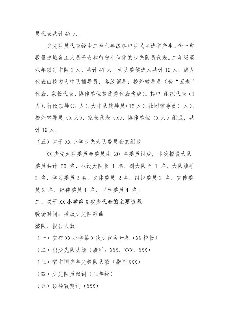 关于召开中国少年先锋队XX小学第X次代表大会的请示尊敬的共青团XX委:中国少年先锋队XX小学第X次代表大会将于XX年XX月XX日召开,按照《中国少年先锋队章程》、《少先队组织工作条例(试行)》相关规定,结合实际情况,现就有关情况请示如下:一、关于中国少年先锋队x小学第一次代表大会的基本情况(一)会议时间2025年11月XX日下午2:20(二)会议地点XX小学报告厅(三)会议指导思想和主要任务以深入宣传贯彻新时代中国特色社会主义思想和二十大大精神为指导,落实《少先队改革方案》,全面回顾和总结我校近年来少先队的工作,进一步明确少先队肩负的使命和任务;听取和审议少先队工作报告:选举产生学校第X届少先队工作委员会和第X届少先队大队委员会,使之更好地服务于少年儿童。(四)关于代表的组成按照相关要求(总人数XX人,产生代表比例为XX%,其中少先队员代表为代表人数的59%,成人代表为代表人41%,)本校有少先队员700人,本次少代会代表包括成人代表和少先队