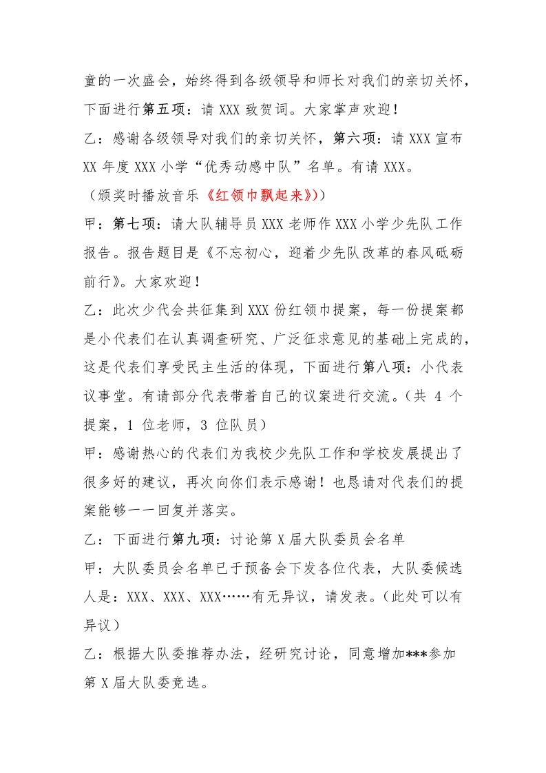中国少年先锋队X小学第X次代表大会主持词(1)甲:尊敬的各位领导、敬爱的辅导员老师、亲爱的少先队员们:齐:大家下午好!甲:沐浴着少先队改革的阳光,吮吸着新时代的气息。乙:我们共同迎来了中国少年先锋队XX小学第X次代表大会。甲:今天,出席我们大会的领导有…乙:参加此次代表大会的还有校外辅导员代表XXX,以及各中队的少先队员代表、部分家长代表,还有来自XXX的大队辅导员老师们和媒体的叔叔阿姨们,欢迎你们的到来!此次少代会得到了XX学校的大力支持,为我们提供了这么好的会场,让我们以热烈的掌声向他们表示衷心的感谢。甲:首先请代理大队长XXX向学校XXX报告人数。(校长)乙:第一项:请XXX小学XXX宣布少代会开幕。(校长)甲:第二项:出旗,少先队员敬礼!乙:礼毕,第三项:唱队歌。有请指挥:XXX乙:全体请坐。第四项:让我们用热烈的掌声欢迎我校少先队员向大会献词(三年级)甲:感谢队员们热情洋溢的献词!少代会是我们全校少年儿
