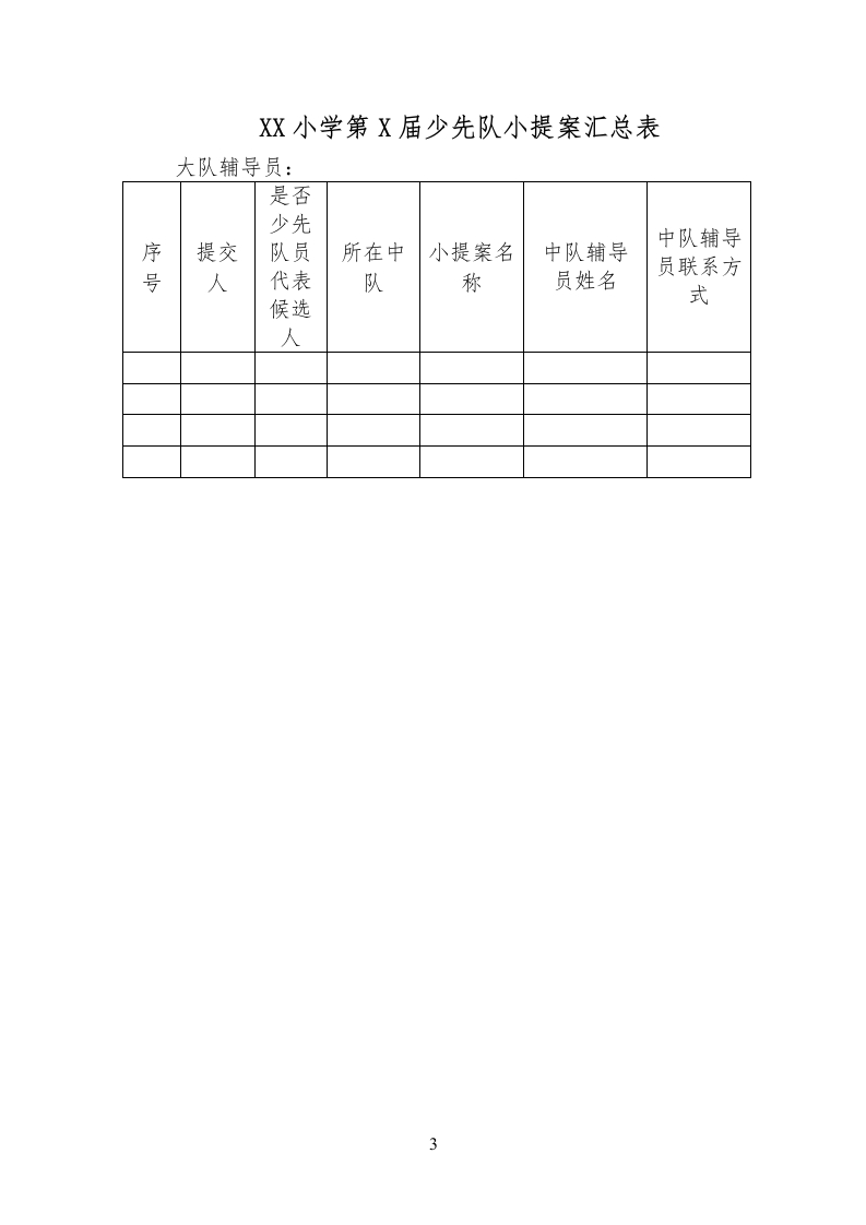 14少代会提案表格及汇总表晨晨老师2个月前发布关注私信36KB3页02210 以下为资料部分截图预览,下载后为超高清原文件。 第1页 / 共3页 第2页 / 共3页 试读已结束,还剩1页,您可下载完整版后进行离线阅读 加入VIP,享海量教务资料,无限制免费下载所有材料 14少代会提案表格及汇总表此内容为付费资源,请付费后查看¥9.99¥15.99VIP会员免费代理(享70%分佣)免费立即购买您当前未登录!建议登陆后购买,可保存购买订单付费资源© 版权声明文章版权归作者所有,未经允许请勿转载。THE END活动方案 文本预览 XXX小学少代会提案表提案题目:提案人:性别:年龄:所在中队:职务:联系方式:提案缘由:提案内容:日期:年月日提案建议:备注说明:1、提案内容要求贴近生活、贴近实际、贴近少年儿童,着重反映学生所关注的现实问题,特别是与少先队员学习生活密切相关、最需要解决的具体问题。2、本表填不下的内容,允许另附页补充,需用黑色圆珠笔认真填写;、少先队员代表提案必须由队员自己撰写及广泛征求意见,成人不予包办代替。4、每中队两份,周三下班前年级统一收齐上交给辅导员。2 查看更多 收起部分 喜欢就支持一下吧点赞10 分享QQ空间微博QQ好友海报分享复制链接收藏