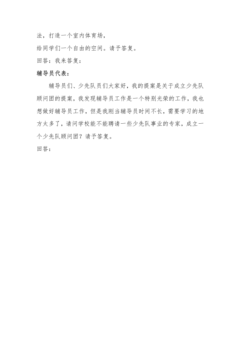 代表议事堂上的发言代表1:辅导员们、少先队员们大家好,我的提案是关于设立红领巾旧货交换市场。我发现由于现在生活条件提高了,队员们的玩具、图书等特别多,大多在家闲置着,造成了很大的浪费,如果能把闲置的物品进行交换。不仅能增强物品的使用率,还能培养我们的自主自立的能力,增强市场经济意识。请答复。回答:我来答复:代表2:大家好,我的提案是关于增加学校图书角,经过我组成员调查,学校给队员们提供图书,轮流阅读,每周统一交换。但是有些同学阅读速度快,如果能增加班级和教学楼内图书角,队员们就能利用课间等零散时间自由选择阅读,同时还希望学校不定期的搞一些读书、写作、讲故事比赛等活动,从而真正的提高队员们的阅读兴趣。请予答复。回答:我来答复:小代表3:辅导员们、少先队员们大家好,我的提案是关于室内体育场的提案,我发现冬季雾霾天和雨雪天气较多,队员们不能满足阳光运动一小时,所以我建议学校建一个室内体育场,雾霾或下雨天,队员们可以去那儿自由活动。希望学校领导尽快想到解决方