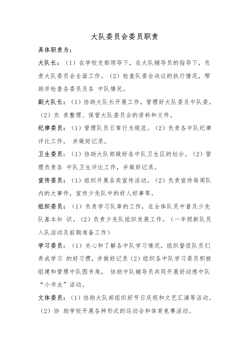 大队委员会委员职责具体职责为:大队长:(1)在学校支部领导下,在大队辅导员的指导下,负责大队委员会全面工作。(2)检查队委会决议的执行情况,帮助并检查各委员及各中队情况。副大队长:(1)协助大队长开展工作,管理好大队委及中队委。(2)负责整理、保管大队委员会的资料和文件。纪律委员:(1)管理队员日常行为规范。(2)负责各中队纪律评比工作,并做好记录。卫生委员:(1)协助大队部做好各中队卫生区的划分。(2)管理负责各中队卫生评比工作,并做好记录。宣传委员:(1)组织开展各类宣传活动。(2)负责宣传每周队内的大事件,宣传少先队中的好人好事等。组织委员:(1)负责学习队章的工作,在全体队员中普及少先队基本知识。(2)负责少先队组织发展工作。(一年级新队员入队活动及前期准备工作)学习委员:(1)关心和了解各中队学习情况,组织督促队员们养成学习的好习惯,并做好记录(2)组织各中队学习委员积极组建和管理中队图书角,协助中队辅导员共同开展好动感中队“小书虫”活动。文体委员:(1)协助大队部组织好节日庆祝和文艺汇演等活动。(2)协助学校开展各种形式的运动会和体育竞赛活动。