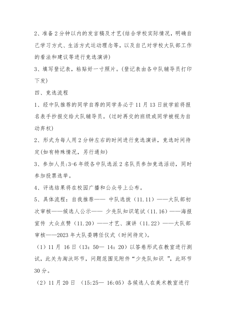 19少代会大队委竞选方案晨晨老师2个月前发布关注私信12.89KB3页02314 以下为资料部分截图预览,下载后为超高清原文件。 第1页 / 共3页 第2页 / 共3页 试读已结束,还剩1页,您可下载完整版后进行离线阅读 加入VIP,享海量教务资料,无限制免费下载所有材料 19少代会大队委竞选方案此内容为付费资源,请付费后查看¥9.99¥15.99VIP会员免费代理(享70%分佣)免费立即购买您当前未登录!建议登陆后购买,可保存购买订单付费资源© 版权声明文章版权归作者所有,未经允许请勿转载。THE END活动方案 文本预览 “红领巾心向党小岗位大梦想”一一2025年大队委竞选方案一、活动宗旨为了实现学校少先队新老大队委员顺利过渡和交接,培养一批热心少先队工作、能积极主动为队员服务的少先队员,并形成“自己的活动自己搞、自己的阵地自己建、自己的事情自己管”的少先队工作新局面。完善学校少先队组织,增强少先队员的民主意识、参与意识和竞争意识,让队员充分发挥民主、参政的意识,选举出自己最满意,同时又能为少先队服务、有威信、有特长、有代表性的大队干部。塘厦镇林村小学举行大队委竞选活动。二、推荐条件:1、各中队竞选(或推荐)产生大队委竞选候选人(每班2人)2、大队候选人进行竞选申请、演讲、才艺展示、答辩三部分,竞选演讲要求说明自己的竞选优势、特长、如何为队员服务等等,演讲时间2分钟以内。答辩,要求候选人现场对队员或辅导员提出的问题进行回答。3、参加竞选的少先队员一定要填写申请表,共两份,分别为学生申请表、家长推荐表、7寸个人生活照。三、具体要求:1、办一份手抄报,能够全面展示自己的成绩、特长、兴趣、爱好。 查看更多 收起部分 喜欢就支持一下吧点赞14 分享QQ空间微博QQ好友海报分享复制链接收藏