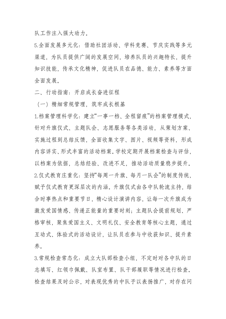 2025-2026学年第一学期少先队工作计划晨晨老师5个月前更新关注私信16.84KB8页04010 以下为资料部分截图预览,下载后为超高清原文件。 第1页 / 共8页 第2页 / 共8页 试读已结束,还剩6页,您可下载完整版后进行离线阅读 加入VIP,享海量教务资料,无限制免费下载所有材料 © 版权声明文章版权归作者所有,未经允许请勿转载。THE END计划总结 文本预览 在时代的壮阔征程中,少先队工作承载着培育未来栋梁的神圣使命。2025年秋季学期,我校少先队以培养能够担当民族复兴大任的时代新人为根本任务,秉持为党育人、为国育才的初心,围绕“德润童心、智启未来、体健少年、美育赋能、劳育铸魂”的核心思路,积极探索创新,精心谋划布局,致力于为少先队员的成长铺就坚实道路。一、工作蓝图:绘制多彩成长画卷1.常规管理规范化:构建科学、精细且完善的常规管理体系,将每一项制度落实到具体行动中,让少先队工作的日常运转有章可循、有序推进,实现从粗放式管理向精细化运作的转变,为队员成长营造稳定、规范的环境。2.思想引领深入化:以爱国主义、集体主义教育为基石,将社会主义核心价值观融入队员的学习与生活点滴,通过多样化的教育方式,引导队员树立正确的世界观、人生观和价值观,筑牢理想信念之基。3活动形式创新化:突破传统活动模式,以红色教育、志愿服务、劳动实践等为重点领域,运用新颖的活动载体和形式,激发队员的参与热情,提升活动的教育实效,让队员在丰富多彩的活动中收获成长。4.队伍建设专业化:打造一支素质过硬、理念先进、富有创新精神的辅导员队伍。通过系统的理论学习、深入的经验交流以及激烈的技能竞赛,不断提升辅导员的专业素养和工作能力,为少先 查看更多 收起部分 喜欢就支持一下吧点赞10 分享QQ空间微博QQ好友海报分享复制链接收藏