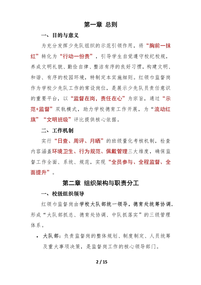 2025年秋季学期学校红领巾监督岗工作实施细则晨晨老师2个月前发布关注私信28.09KB15页0309 以下为资料部分截图预览,下载后为超高清原文件。 第1页 / 共15页 第2页 / 共15页 试读已结束,还剩13页,您可下载完整版后进行离线阅读 加入VIP,享海量教务资料,无限制免费下载所有材料 2025年秋季学期学校红领巾监督岗工作实施细则此内容为付费资源,请付费后查看¥9.99¥15.99VIP会员免费代理(享70%分佣)免费立即购买您当前未登录!建议登陆后购买,可保存购买订单付费资源© 版权声明文章版权归作者所有,未经允许请勿转载。THE END活动方案 文本预览 2025-2026学年第一学期学校红领巾监督岗实施细则第一章总则.2一、目的与意义;二、工作机制……2第二章组织架构与职责分工.2一、校级组织领导2二、直接责任人职责3三、监督员职责.3第三章监督员选拔与培训…4一、选拔流程;二、岗前培训……4第四章分时段值岗操作规范…..5一、早读及晨会前(7:50-8:20).5二、大课间(10:00-10:20)6三、午餐及午休(12:00-12:30).7四、下午课间(15:00-15:20).8五、放学后(16:30-16:50).9六、周一升旗仪式(全校集合时段).10第五章日常检查与记录流程…11第六章考核评价体系….12第七章奖励与整改措施,.13第八章附则…151/15 查看更多 收起部分 喜欢就支持一下吧点赞9 分享QQ空间微博QQ好友海报分享复制链接收藏