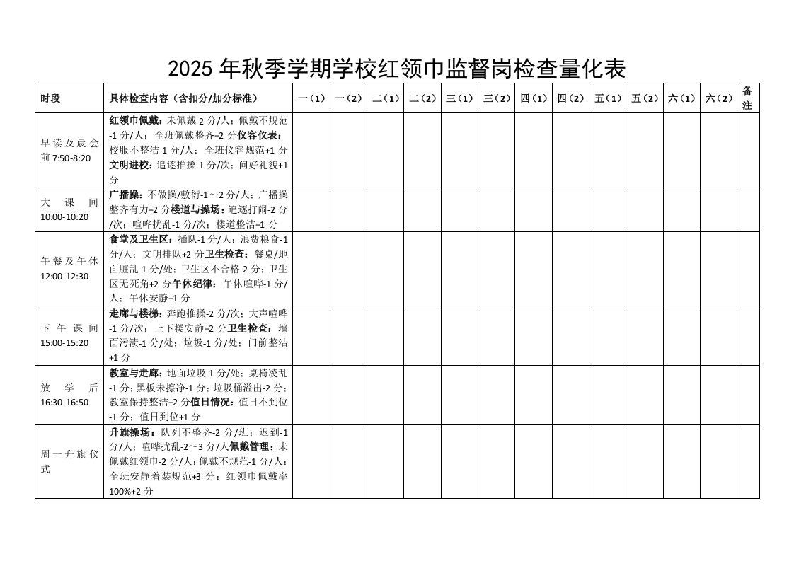 2025年秋季学期学校红领巾监督岗检查量化表时段具体检查内容(含扣分/加分标准)-(1)一(2)二(1)二(2)三(1)三(2)四(1)四(2)五(1)五(2)六(1)六(2)备注红领巾佩戴:未佩戴-2分/人:佩戴不规范1分/人:全班佩戴整齐+2分仪容仪表:早读及晨会校服不整洁-1分/人:全班仪容规范+1分前7:50-8:20文明进校:追逐推搡-1分/次:问好礼貌+1分广播操:不做操/墩衍-1~2分/人:广播操大课间整齐有力+2分楼道与操场:追逐打闹-2分10:00-10:20/次:喧哗扰乱-1分/次:楼道整洁+1分食堂及卫生区:插队-1分/人:浪费粮食-1午餐及午休分/人:文明排队+2分卫生检查:餐桌/地面脏乱-1分/处:卫生区不合格-2分:卫生12:00-12:30区无死角+2分午休纪律:午休喧哗-1分/人:午休安静+1分走廊与楼梯:奔跑推搡-2分/次:大声喧哗下午课间-1分/次:上下楼安静+2分卫生检查:墙15:00-15:20面污渍-1分/处:垃圾-1分/处:门前整洁+1分教室与走廊:地面垃圾-1分/处:桌椅凌乱放学后1分:黑板未擦净-1分:垃圾桶溢出-2分:1630-16:50教室保持整洁+2分值日情况:值日不到位-1分:值日到位+1分升旗操场:队列不整齐-2分/班:迟到-1分/人:喧哗扰乱-2~3分/人佩戴管理:未周一升旗仪式佩戴红领巾-2分/人:佩戴不规范-1分/人:全班安静着装规范+3分:红领巾佩戴率100%+2分