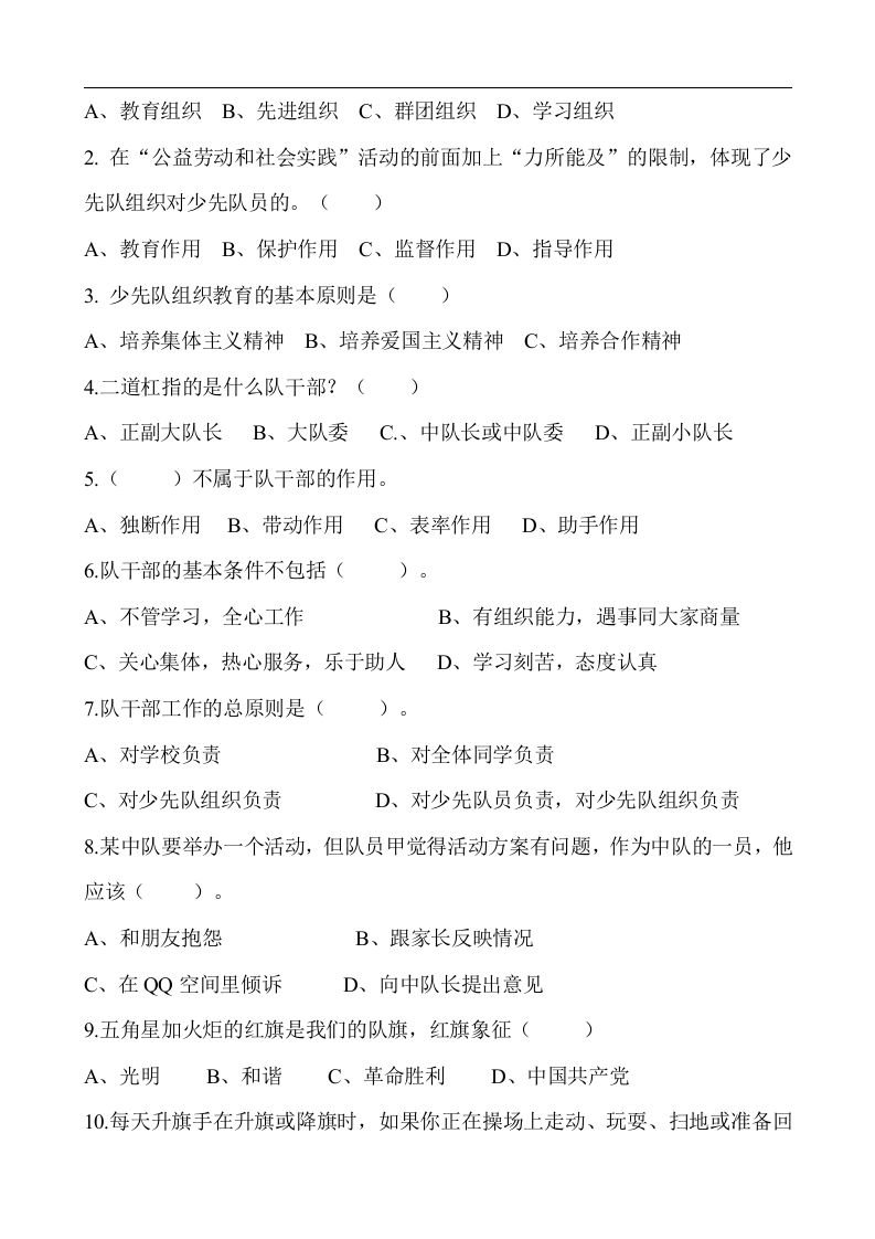 2025学年少先队大队委竞选笔试姓名:中队:分数:亲爱的少先队员们:非常欢迎你们加入XX小学少先大队干部竞选上岗的行列中,希望你们能在笔试这一环节中取得好的成绩!一、填空题(40分)1.我们的队名是简称2.我们队的创立者和领导者是3.我们的队旗是我们的队徽由和写有“中国少先队”的红色绶带组成。4.我们的队礼是右手五指并拢,高举头上,它表示5.我们的作风是6.少先队建队日是(1949)年月日,今年是中国少年先锋队组织建队周年。7.少先队的呼号是回答:8.社会主义核心价值观的基本内容,富强、民主、是国家层面的价值目标,自由、平等、法治、法治是的价值取向,爱国、敬业、是公民个人层面的价值准则。二、选择题(30分)1.少先队是中国少年儿童的(),是少年儿童学习中国特色社会主义和共产主义的学校,是建设社会主义和共产主义的预备队。