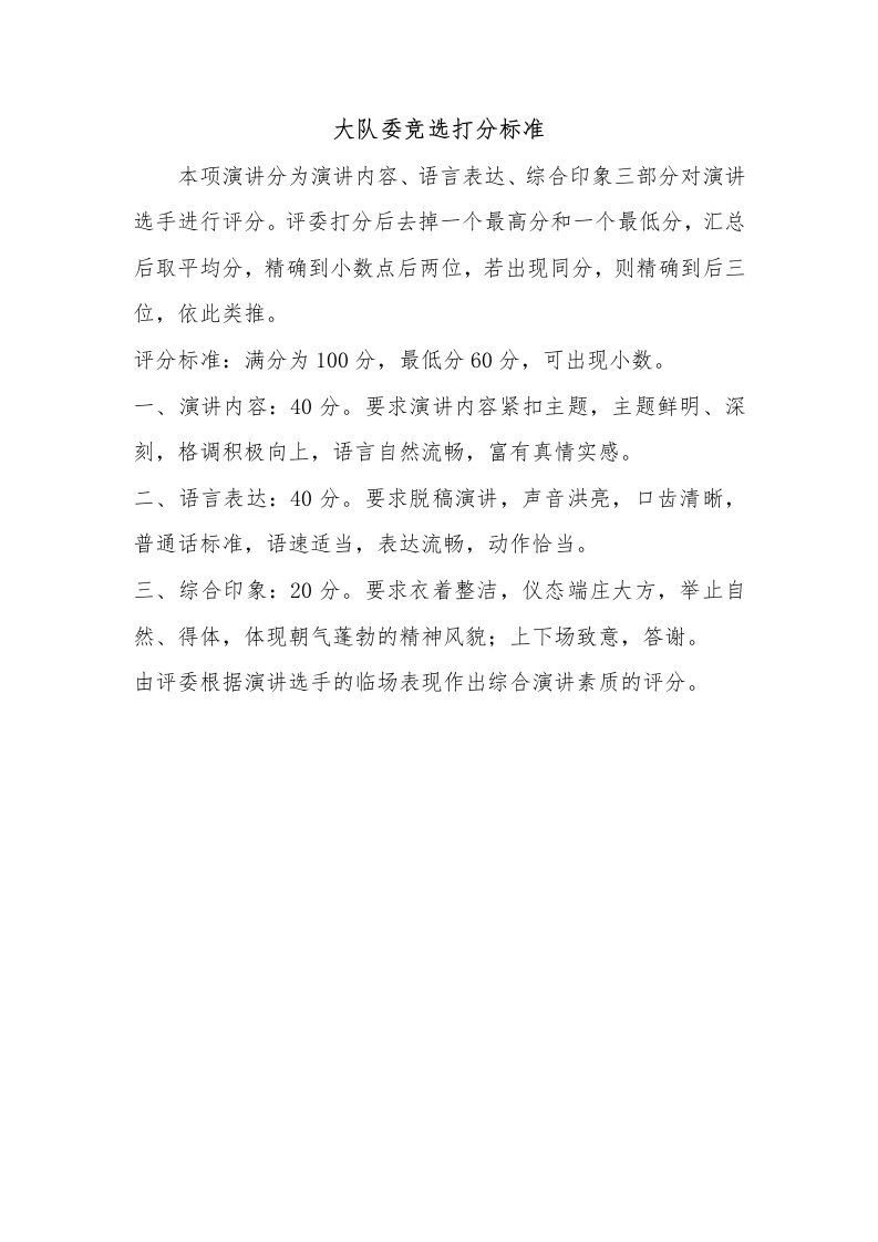 26少代会大队委面试评分表及评分标准晨晨老师2个月前发布关注私信0.24MB2页04611 以下为资料部分截图预览,下载后为超高清原文件。 第1页 / 共2页 第2页 / 共2页 已完成全部阅读,共2页 加入VIP,享海量教务资料,无限制免费下载所有材料 26少代会大队委面试评分表及评分标准此内容为付费资源,请付费后查看¥9.99¥15.99VIP会员免费代理(享70%分佣)免费立即购买您当前未登录!建议登陆后购买,可保存购买订单付费资源© 版权声明文章版权归作者所有,未经允许请勿转载。THE END活动方案 文本预览 xx小学大队委评分表姓名竞聘职务竞聘演讲才艺展示知识问答总分号(5分,不(3分)(2分)脱稿一0.5分)234568910111213141516171819202122232425 查看更多 收起部分 喜欢就支持一下吧点赞11 分享QQ空间微博QQ好友海报分享复制链接收藏
