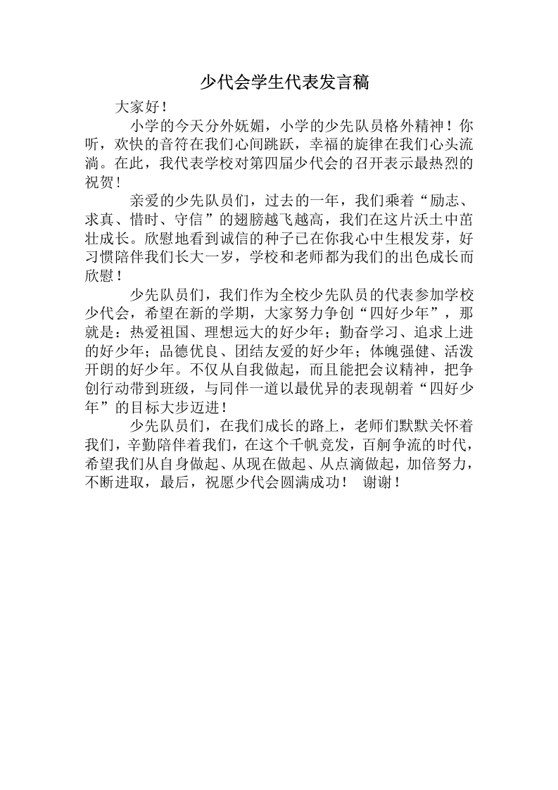 少代会学生代表发言稿大家好!小学的今天分外妩媚,小学的少先队员格外精神!你听,欢快的音符在我们心间跳跃,幸福的旋律在我们心头流淌。在此,我代表学校对第四届少代会的召开表示最热烈的祝贺!亲爱的少先队员们,过去的一年,我们乘着“励志、求真、惜时、守信”的翅膀越飞越高,我们在这片沃土中茁壮成长。欣慰地看到诚信的种子己在你我心中生根发芽,好习惯陪伴我们长大一岁,学校和老师都为我们的出色成长而欣慰!少先队员们,我们作为全校少先队员的代表参加学校少代会,希望在新的学期,大家努力争创“四好少年”,那就是:热爱祖国、理想远大的好少年;勤奋学习、追求上进的好少年:品德优良、团结友爱的好少年;体魄强健、活泼开朗的好少年。不仅从自我做起,而且能把会议精神,把争创行动带到班级,与同伴一道以最优异的表现朝着“四好少年”的目标大步迈进!少先队员们,在我们成长的路上,老师们默默关怀着我们,辛勤陪伴着我们,在这个千帆竞发,百舸争流的时代,希望我们从自身做起、从现在做起、从点滴做起,加倍努力,不断进取,最后,祝愿少代会圆满成功!谢谢!