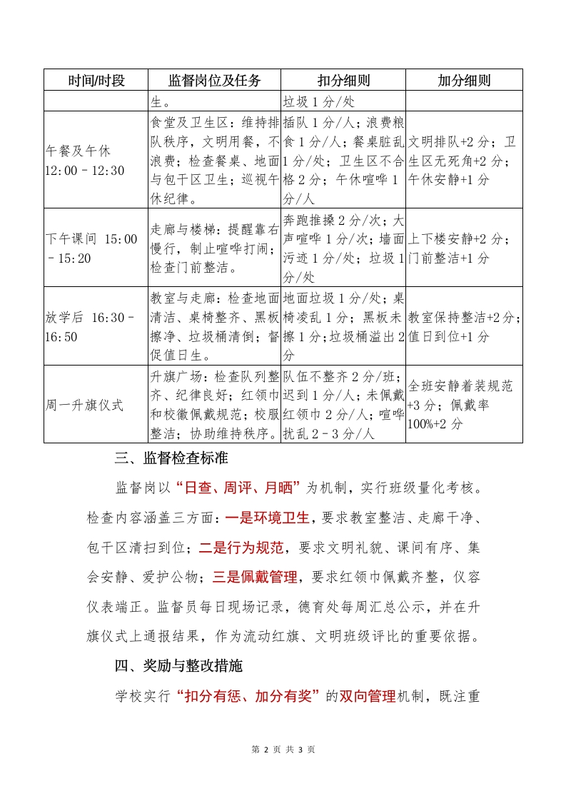 2025年秋季学期红领巾监督岗管理制度晨晨老师2个月前发布关注私信0.29MB3页0249 以下为资料部分截图预览,下载后为超高清原文件。 第1页 / 共3页 第2页 / 共3页 试读已结束,还剩1页,您可下载完整版后进行离线阅读 加入VIP,享海量教务资料,无限制免费下载所有材料 2025年秋季学期红领巾监督岗管理制度此内容为付费资源,请付费后查看¥9.99¥15.99VIP会员免费代理(享70%分佣)免费立即购买您当前未登录!建议登陆后购买,可保存购买订单付费资源© 版权声明文章版权归作者所有,未经允许请勿转载。THE END活动方案 文本预览 红领巾监督岗管理制度一监督在岗,责任在心把“胸前一抹红”转化为“行动一份责”,红领巾监督岗是我校少先队工作的常设岗位,是展示少先队员责任意识的重要平台。以红领巾为标志,发挥示范与监督作用,引导学生自觉遵守校纪校规,养成文明礼貌、勤俭自律、整洁有序的良好习惯。一、组织与职责红领巾监督岗由校大队部统一领导,德育处统筹协调,各中队具体落实。大队辅导员是监督岗的直接责任人,负责值岗安排、考核反馈和奖惩评比;中队辅导员承担日常指导和督促职能,确保监督员在岗在责、文明执勤。监督员由各中队推荐政治素质好、责任心强、纪律意识高的队员担任。二、值岗时间与职责监督岗实行分时段、分岗位、分任务的值岗机制,采取“两人一组、搭档监督”的模式,确保检查全面覆盖、监督不留盲区。具体安排如下:时间时段监督岗位及任务扣分细则加分细则校门口与走廊:检查红未佩戴红领巾2分/早读及晨会前领巾佩戴、校服整洁、人;佩戴不规范1分全班佩戴整齐+2分;7:30-7:50文明进校;制止追逐推人:仪容不整1分/人:问好礼貌+1分搡;提醒问候礼仪。喧哗追逐1分/次大课间10:00-楼道与操场:监督广播不做操或敷衍1-2分播操整齐有力+2操规范,口号洪亮;制/人;追逐打闹2分/10:20止打闹;检查走廊卫分;楼道整洁+1分次;喧哗扰乱1分/次;第1页共3页 查看更多 收起部分 喜欢就支持一下吧点赞9 分享QQ空间微博QQ好友海报分享复制链接收藏