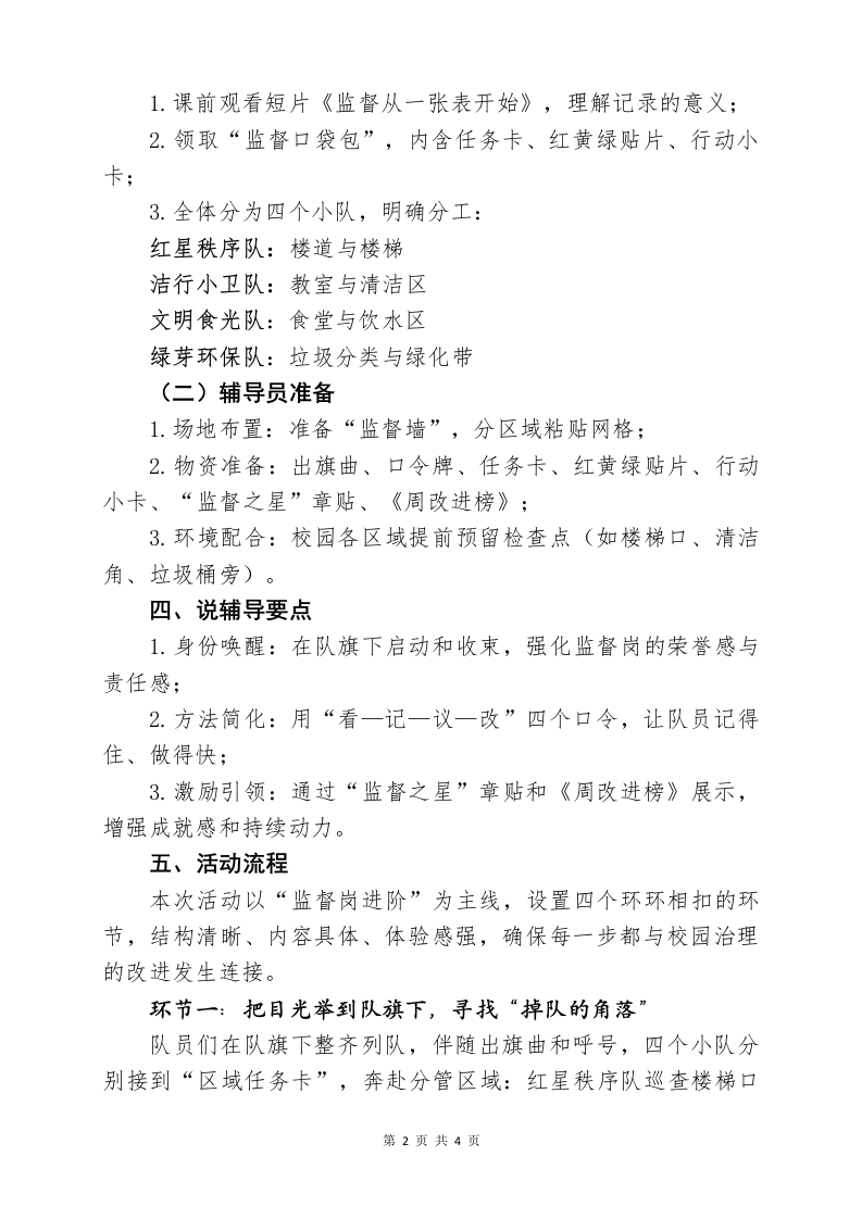少先队辅导员活动课获奖说课稿(红领巾监督岗,小行动大成长)晨晨老师2个月前发布关注私信0.29MB4页02910 以下为资料部分截图预览,下载后为超高清原文件。 第1页 / 共4页 第2页 / 共4页 试读已结束,还剩2页,您可下载完整版后进行离线阅读 加入VIP,享海量教务资料,无限制免费下载所有材料 少先队辅导员活动课获奖说课稿(红领巾监督岗,小行动大成长)此内容为付费资源,请付费后查看¥9.99¥15.99VIP会员免费代理(享70%分佣)免费立即购买您当前未登录!建议登陆后购买,可保存购买订单付费资源© 版权声明文章版权归作者所有,未经允许请勿转载。THE END活动方案 文本预览 少先队辅导员活动课获奖说课稿一红领巾监督岗,小行动大成长尊敬的各位评委、辅导员老师们:今天的说课主题是《红领巾监督岗,小行动大成长》。我们以监督岗日常使用的记录表为切口,引导队员走过一段“看一记一议一改”的治理旅程。队员们将在分小队巡查、填写任务卡、商议行动、现场快改的过程中争取“组织章、劳动章”,用眼晴发现问题,用双手完成改进,让校园更整洁,让责任更鲜明。下面我将从活动背景、活动目标、活动准备、辅导要点、活动流程以及活动评价六个板块依次展开说课。一、说活动背景以往的红领巾监督岗,更多停留在“记录”上,谁没有排队,哪儿不整洁,写下来就算完成。但问题写在纸上,并没有真正走向解决。为此,我们设计了本课《红领巾监督岗,小行动大成长》。课程以一张监督岗记录卡为主线,通过“把目光举到队旗下、把事实落在任务卡、把办法长在小圈里、把改变发生在此刻”四个环节,让队员真正体验到:监督不是挑刺,而是推动改变。课程紧扣《少先队活动课程指导纲要(2021年版)》中提出的“贴近生活、参与治理、注重体验”,融入“红领巾争章”,让队员从发现到改进形成完整闭环。二、说活动目标通过分小队区域巡查,引导队员发现校园中真实存在的“掉队角落”;记录任务卡,培养队员客观表达与简洁记录的能力;小圈讨论,学会在团队中快速生成可行方案并落实责任;现场快改和成效展示,帮助队员在实践中体验治理的成就感与责任感。三、说活动准备(一)队员准备第1页共4页 查看更多 收起部分 喜欢就支持一下吧点赞10 分享QQ空间微博QQ好友海报分享复制链接收藏