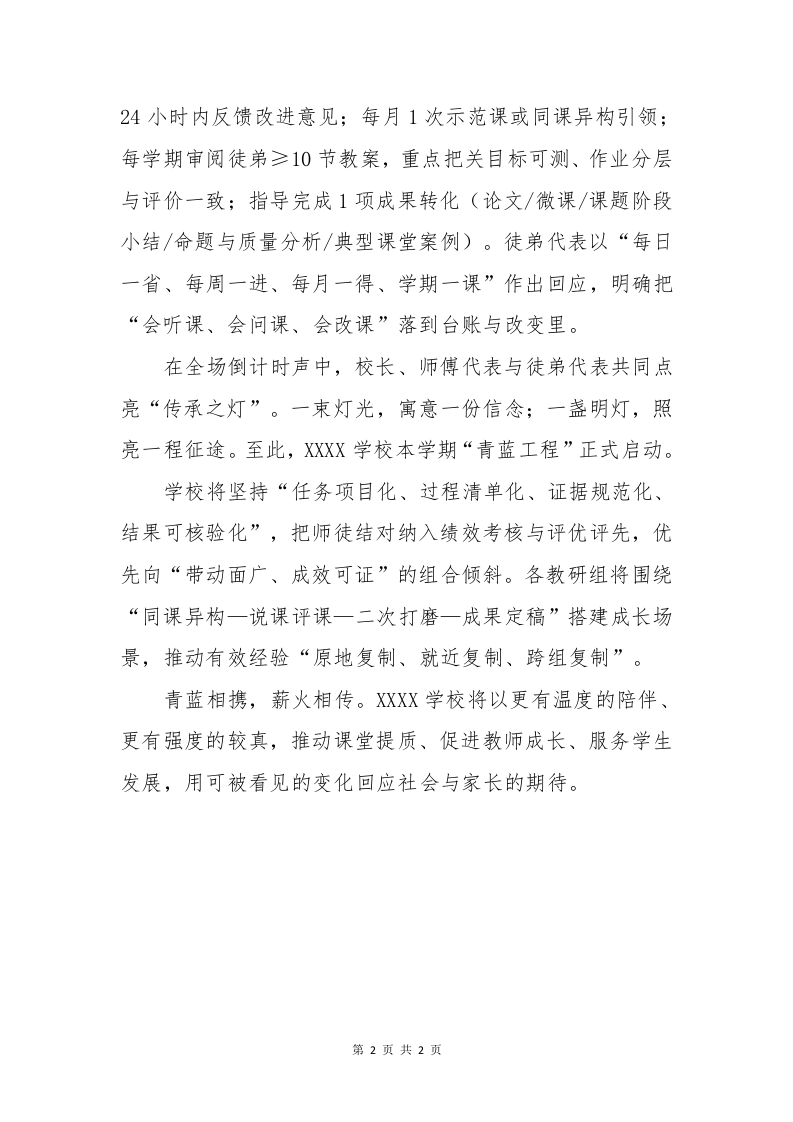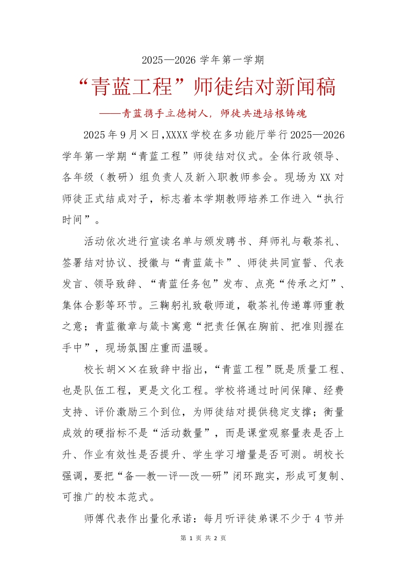 2025一2026学年第一学期“青蓝工程”师徒结对新闻稿一青蓝携手立德树人,师徒共进培根铸魂2025年9月×日,XXXX学校在多功能厅举行2025一2026学年第一学期“青蓝工程”师徒结对仪式。全体行政领导、各年级(教研)组负责人及新入职教师参会。现场为XX对师徒正式结成对子,标志着本学期教师培养工作进入“执行时间”。活动依次进行宣读名单与颁发聘书、拜师礼与敬茶礼、签署结对协议、授徽与“青蓝箴卡”、师徒共同宣誓、代表发言、领导致辞、“青蓝任务包”发布、点亮“传承之灯”、集体合影等环节。三鞠躬礼致敬师道,敬茶礼传递尊师重教之意;青蓝徽章与箴卡寓意“把责任佩在胸前、把准则握在手中”,现场氛围庄重而温暖。校长胡××在致辞中指出,“青蓝工程”既是质量工程、也是队伍工程,更是文化工程。学校将通过时间保障、经费支持、评价激励三个到位,为师徒结对提供稳定支撑;衡量成效的硬指标不是“活动数量”,而是课堂观察量表是否上升、作业有效性是否提升、学生学习增量是否可测。胡校长强调,要把“备一教一评一改一研”闭环跑实,形成可复制、可推广的校本范式。师傅代表作出量化承诺:每月听评徒弟课不少于4节并第1页共2页