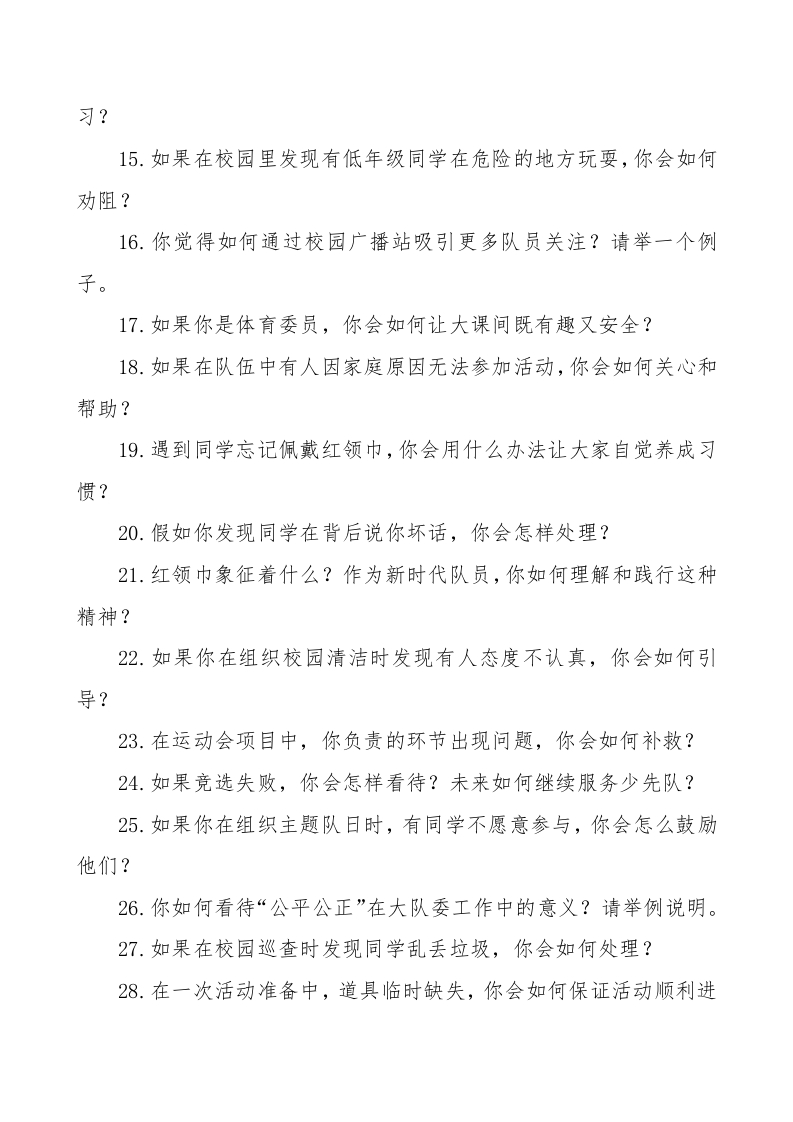 6.2025年大队委竞选面试题库晨晨老师5个月前发布关注私信0.18MB3页03811 以下为资料部分截图预览,下载后为超高清原文件。 第1页 / 共3页 第2页 / 共3页 试读已结束,还剩1页,您可下载完整版后进行离线阅读 加入VIP,享海量教务资料,无限制免费下载所有材料 6.2025年大队委竞选面试题库此内容为付费资源,请付费后查看¥9.99¥15.99VIP会员免费代理(享70%分佣)免费立即购买您当前未登录!建议登陆后购买,可保存购买订单付费资源© 版权声明文章版权归作者所有,未经允许请勿转载。THE END活动方案 文本预览 2025年大队委竞选面试题库一小岗位托举大梦想红领巾伴我共成长1.如果你成为大队长,你会如何带领整个大队委团队高效开展工作?2.当你与中队长在工作中意见不同,你会如何处理?3.你认为宣传委员在学校少先队活动中的核心任务是什么?4.如果你担任旗手,遇到升旗时突遇大风,你会怎样保证仪式顺利完成?5.劳动委员怎样才能让卫生检查做到公平公正?请结合实际谈谈。6.如果在一次大型活动中有同学临时缺席,你会如何调整分工?7.如果你在巡查时发现高年级同学违反纪律,但态度不服从,你会怎么做?8.假如你组织的活动时间不够,流程还未完成,你会如何调整?9.如果你的家长担心大队委工作影响学习,你会怎么说服他们支持你?10.在一次升旗仪式中,你突然忘记稿子内容,你会怎样应对?11.作为大队委,如果有同学不喜欢你并质疑你,你会如何化解矛盾?12.如果在一次环保活动中发现有同学偷懒,你会如何带动大家积极参与?13.你认为大队委最重要的品质是什么?请结合实际谈谈。14.在一次红领巾知识测试中,如果成绩不理想,你会如何改进学 查看更多 收起部分 喜欢就支持一下吧点赞11 分享QQ空间微博QQ好友海报分享复制链接收藏