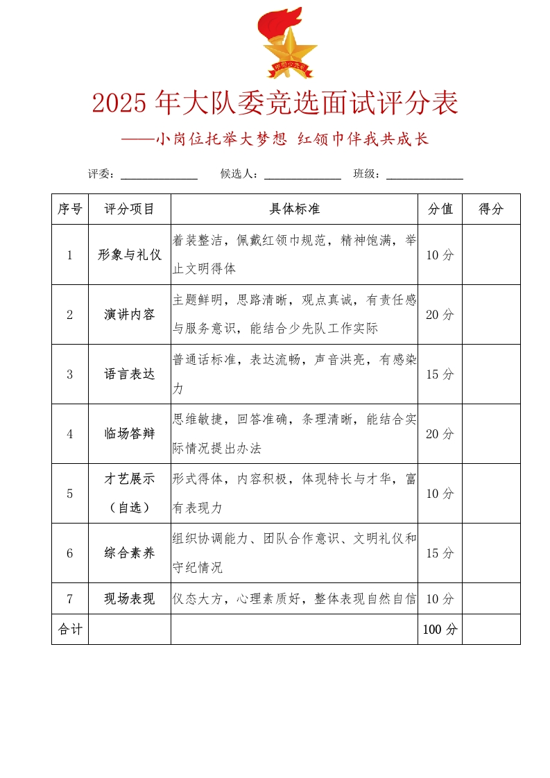 2025年大队委竞选面试评分表一小岗位托举大梦想红领巾伴我共成长评委:候选人:班级:序号评分项目具体标准分值得分着装整洁,佩戴红领巾规范,精神饱满,举形象与礼仪10分止文明得体主题鲜明,思路清晰,观点真诚,有责任感2演讲内容20分与服务意识,能结合少先队工作实际普通话标准,表达流畅,声音洪亮,有感染3语言表达15分力思维敏捷,回答准确,条理清晰,能结合实4临场答辩20分际情况提出办法才艺展示形式得体,内容积极,体现特长与才华,富510分(自选)有表现力组织协调能力、团队合作意识、文明礼仪和6综合素养15分守纪情况7现场表现仪态大方,心理素质好,整体表现自然自信10分合计100分