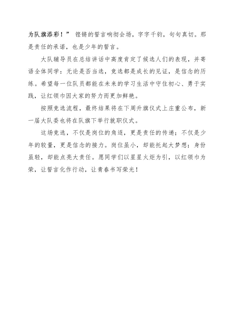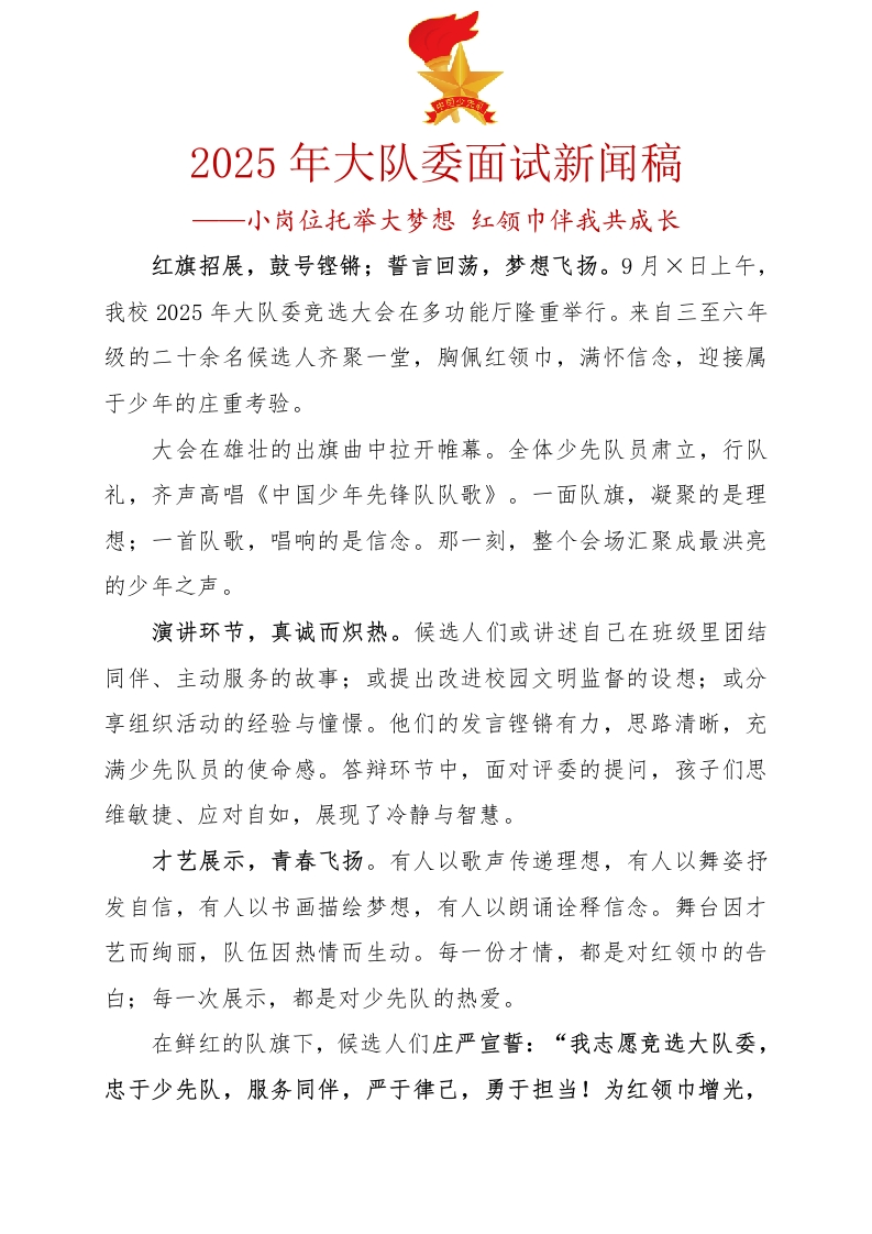 2025年大队委面试新闻稿一小岗位托举大梦想红领巾伴我共成长红旗招展,鼓号铿锵;誓言回荡,梦想飞扬。9月×日上午,我校2025年大队委竞选大会在多功能厅隆重举行。来自三至六年级的二十余名候选人齐聚一堂,胸佩红领巾,满怀信念,迎接属于少年的庄重考验。大会在雄壮的出旗曲中拉开帷幕。全体少先队员肃立,行队礼,齐声高唱《中国少年先锋队队歌》。一面队旗,凝聚的是理想;一首队歌,唱响的是信念。那一刻,整个会场汇聚成最洪亮的少年之声。演讲环节,真诚而炽热。候选人们或讲述自己在班级里团结同伴、主动服务的故事;或提出改进校园文明监督的设想;或分享组织活动的经验与憧憬。他们的发言铿锵有力,思路清晰,充满少先队员的使命感。答辩环节中,面对评委的提问,孩子们思维敏捷、应对自如,展现了冷静与智慧。才艺展示,青春飞扬。有人以歌声传递理想,有人以舞姿抒发自信,有人以书画描绘梦想,有人以朗诵诠释信念。舞台因才艺而绚丽,队伍因热情而生动。每一份才情,都是对红领巾的告白;每一次展示,都是对少先队的热爱。在鲜红的队旗下,候选人们庄严宣誓:“我志愿竞选大队委,忠于少先队,服务同伴,严于律己,勇于担当!为红领巾增光,