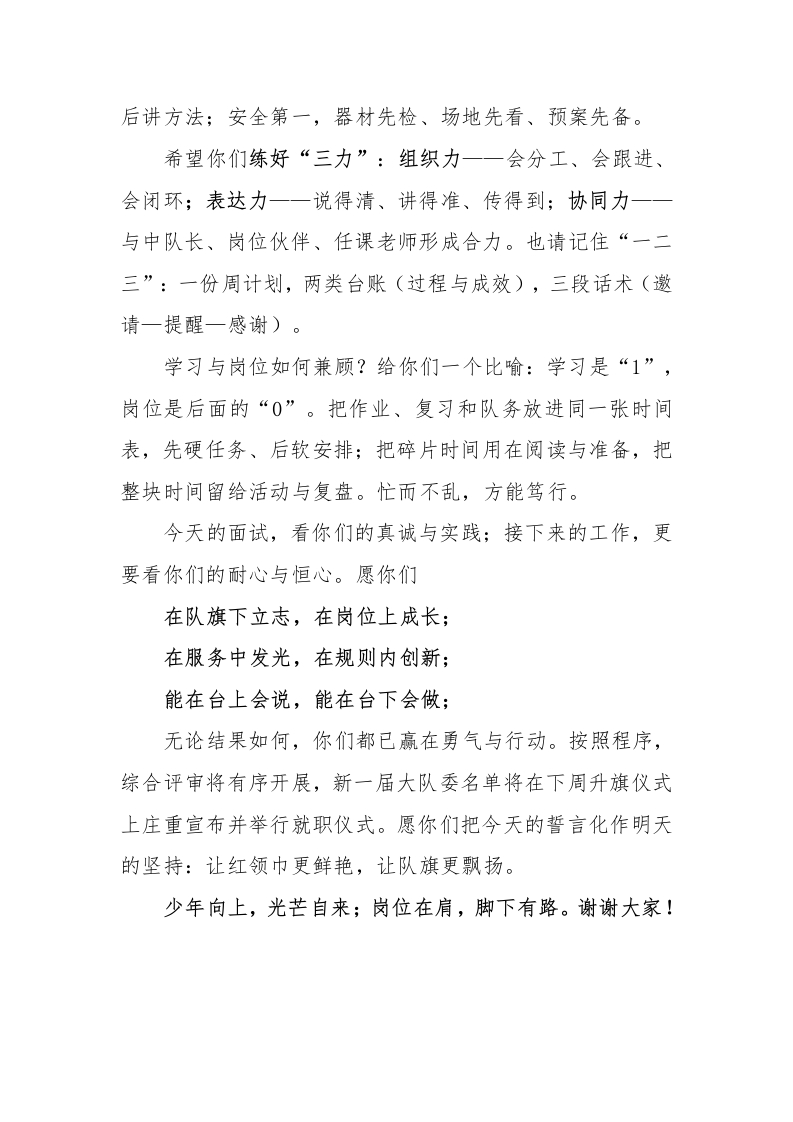 大队委竞聘面试辅导员讲话稿一小岗位托举大梦想红领巾伴我共成长各位老师、亲爱的少先队员们:红旗招展,鼓号铿锵:星星火炬,照亮前路。今天,我们在队旗下相聚,举行大队委竞选面试。首先,向勇敢走上讲台的每一位队员致意一一你们敢于亮相、愿意服务,本身就是最动人的荣誉章。大队委,不是头衔,是责任;不是“被看见”,而是“能看见”。看见同伴的需要、活动的细节、规则的边界、风险的苗头。岗位虽小,心要向大;袖章不重,肩当能扛。我想送给大家“四句话,十二个字”一一心中有旗、眼里有同、手上有法、肩上有当。心中有旗:懂队章、守礼仪,会口令,准流程;升旗、呼号、宣誓,每一步都要稳、要准、要敬。眼里有同:愿意倾听,善于包容;对困难队员多一份耐心,对低年级多一步提醒,在“动感中队”“志愿服务”里让每个人都有参与感。手上有法:会策划、会沟通、会复盘。策划有目标、流程、时间表;沟通有对象、方法、记录;复盘有数据、有照片、有改进。给大家一个“四张清单”:任务清单、物资清单、问题清单、风险清单。清单在手,心中不慌。肩上有当:公平公正,公开透明;碰到分歧先讲规则、