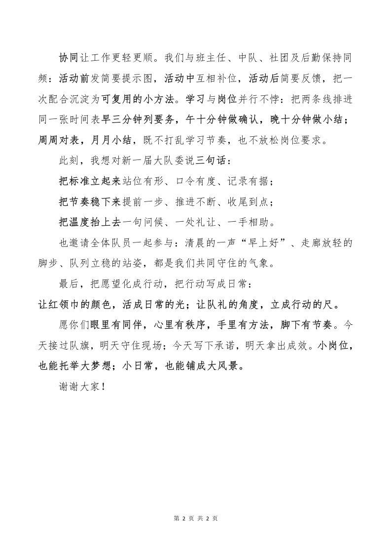 就职仪式大队辅导员讲话稿一小岗位托举大梦想红领巾伴我共成长尊敬的老师、亲爱的同学们、家长朋友们:大家好!在鲜艳的队旗下,我们迎来新一届大队委就职。祝贺当选的同学,也感谢一直支持少先队工作的老师与家长。今天,荣誉别在胸前,更要把责任落在日常;岗位各有分工,但方向只有一个为队旗添彩、为同伴服务、为校园增温。我想与大家约定三把尺,用来校准我们的姿态与行动。第一把:时间尺节奏有序。早到半拍,准点上线,收尾干净;升旗、集合、路队,对齐“到场、到位、到心”。到场不是到一半、到点不是恰好,提前一步才能稳住全场:节奏一稳,现场自顺。第二把:规范尺做事有章。用短清单、明站位、简口令把话说清、把事做稳;一事一表、一项一记,做到看得见、跟得上、查得到。需要时就地示范动作,先把关键动作接住,再把流程传给同伴;一句“交给我”落在手上,一句“我们一起”落在队上。规范不是板着脸,而是让每一步更可执行、更易协同。第三把:服务尺温暖可感。微笑提醒、礼让三分;对低年级多走半步,对临时困难多伸一手。楼梯口设问询点,图书角放暖心盒,社团安排互助时刻;值周时坚持“看角落、看拐弯、看停留点;问去向、问需求;提醒间距与次序”。服务不必张扬,但要被看见、被接住、被记住。让三把尺落在地上,却能让行动不慌、协作不乱、进步不丢。第1页共2页