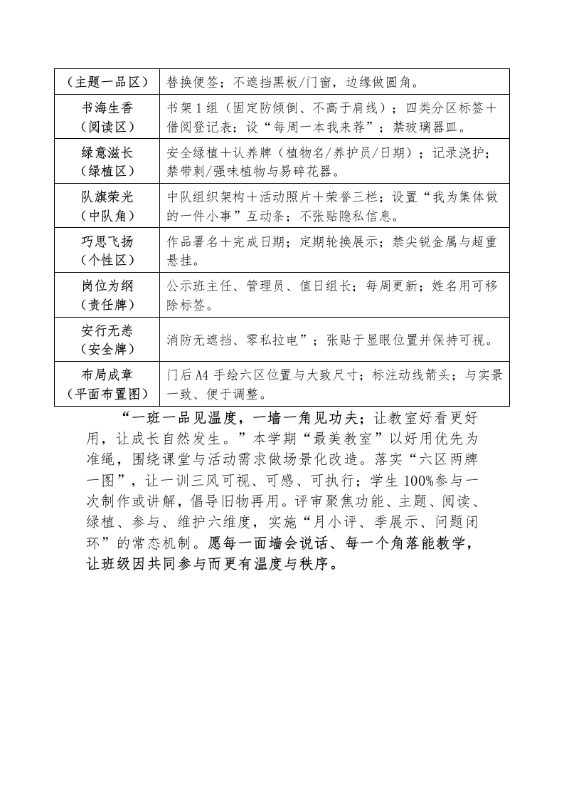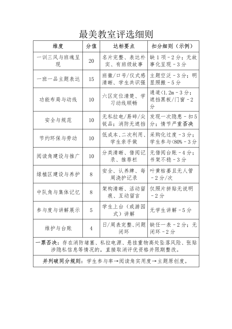 2025年中小学最美教室评选方案晨晨老师2个月前发布关注私信0.28MB4页04214 以下为资料部分截图预览,下载后为超高清原文件。 第1页 / 共4页 第2页 / 共4页 第3页 / 共4页 试读已结束,还剩1页,您可下载完整版后进行离线阅读 加入VIP,享海量教务资料,无限制免费下载所有材料 2025年中小学最美教室评选方案此内容为付费资源,请付费后查看¥9.99¥15.99VIP会员免费代理(享70%分佣)免费立即购买您当前未登录!建议登陆后购买,可保存购买订单付费资源© 版权声明文章版权归作者所有,未经允许请勿转载。THE END专用教室 文本预览 中小学“最美教室”评选方案一方寸之间藏天地,陋室无言皆育人一、指导思想为扎实推进班级软文化和环境育人,构建低成本、可复制、可持续的班级生态,以“让空间说话”为核心,鼓励用朴素文字与真实照片讲述班级的小故事:一张前后对比图、一则同学的使用感受、三条可执行的班级承诺。减少堆砌式装饰,强化可读性与可参与性:每个展示都有负责人、每件作品都有说明、每个角落都有用途让教室从“好看”走向“好用、好学、好管”。二、活动目标有标识:每班形成“班级文化名片”(班名、口号、班风、班训、班主任寄语、班徽)并上墙。有功能:完成“六区”基础布置(见第四部分),并能支撑日常学习与活动。有参与:全体学生100%参与一次设计/制作或讲解任务:有安全:实现“零隐患、零违禁、零占通道”。三、活动原则三低:低成本(建议≤200元/班)、低风险、低维护。三自:自主设计、自主施工、自主讲解。三不:不攀比、不铺张、不照抄照搬。一训三风落地:校训、校风、教风、学风转化为可看可感的班级行为约定与日常仪式。四、空间分区与布置要点区域要求德礼成章上墙“一训三风”十班级文化名片(班名、口号、班风、(班魂墙)班训、寄语、班徽);配3-5张“班魂小故事”照片并附一句说明:一品流芳班徽/班歌/口号十值日岗位牌;设置“梦想树/愿望夹”可 查看更多 收起部分 喜欢就支持一下吧点赞14 分享QQ空间微博QQ好友海报分享复制链接收藏