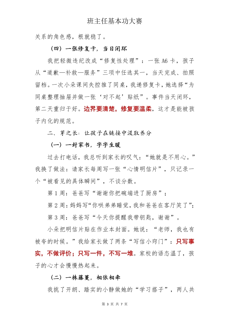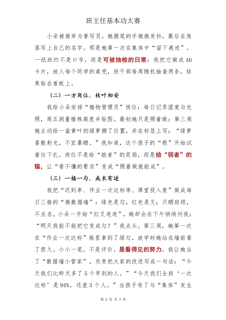 我的育人故事——根芽花晨晨老师2个月前发布关注私信0.38MB7页04112 以下为资料部分截图预览,下载后为超高清原文件。 第1页 / 共7页 第2页 / 共7页 第3页 / 共7页 试读已结束,还剩4页,您可下载完整版后进行离线阅读 加入VIP,享海量教务资料,无限制免费下载所有材料 我的育人故事——根芽花此内容为付费资源,请付费后查看¥9.99¥15.99VIP会员免费代理(享70%分佣)免费立即购买您当前未登录!建议登陆后购买,可保存购买订单付费资源© 版权声明文章版权归作者所有,未经允许请勿转载。THE END专用教室 文本预览 班主任基本功大赛我的育人故事根丨芽1花三月的风还带着凉意。课间铃响,小朵在走廊尽头拽住我:“老师,我不想上学了。”她低着头,指尖紧紧捏着袖口。作业缺交、测验失利、同伴交往几乎为零,这个孩子像一棵被风吹倒的小苗,泥土未实,根须未展。教育不能只劝,只盯分数;教育得先“培土”。于是,我决定用“根|芽花”的路子做一次慢而笃定的尝试:先让她在规范中安身立命,再为她搭好链接的养分通道,最后把她托到可以盛放的舞台上。一、根之定:让孩子在规范中安身立命(一)一纸班约,落笔有声开学第一周,我把讲台搬到教室后面,让孩子们围坐讨论:“你希望在怎样的班级生活?”大家把想法写在便签上:安静、自律、不嘲笑、不迟到、互相帮忙…我把这些“孩子语言”凝成十条《班级小约定》,每条都短小可执行:进门问好,衣着整洁:早读低声,课前备具;上课“三到”(眼到、口到、手到);课间轻跑,不追逐打闹:作业“四到位”(看懂一完成一自查一上交);第1页共7页 查看更多 收起部分 喜欢就支持一下吧点赞12 分享QQ空间微博QQ好友海报分享复制链接收藏