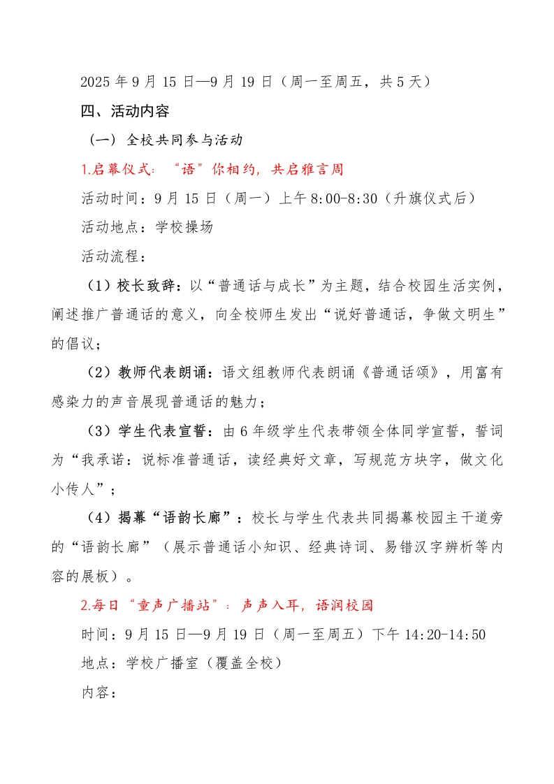 “雅言传承文明,经典浸润人生”——XX小学第28届推广普通话活动方案晨晨老师2个月前发布关注私信24.20KB8页03612 以下为资料部分截图预览,下载后为超高清原文件。 第1页 / 共8页 第2页 / 共8页 试读已结束,还剩6页,您可下载完整版后进行离线阅读 加入VIP,享海量教务资料,无限制免费下载所有材料 “雅言传承文明,经典浸润人生”——XX小学第28届推广普通话活动方案此内容为付费资源,请付费后查看¥9.99¥15.99VIP会员免费代理(享70%分佣)免费立即购买您当前未登录!建议登陆后购买,可保存购买订单付费资源© 版权声明文章版权归作者所有,未经允许请勿转载。THE END学校活动 文本预览 “雅言传承文明,经典浸润人生”光明小学第28届雅打普通话活动万案“一字一句普通话,千言万语绘中华。”当珠穆朗玛峰的晨光映照雪原,当南海的波涛轻抚礁石,当塞北的风声掠过原野,一种共同的声音将这广袤土地上的心灵紧密相连一一这便是普通话。它是穿越千年的文化回响,是《诗经》的婉转,《楚辞》的豪迈,是唐诗宋词里的平仄韵律;它更是迈向未来的时代桥梁,是科技创新的交流基石,是民族团结的坚实纽带。作为中华文明的瑰宝和现代中国的象征,推广普通话,不仅是国家意志,更是我们教育工作者肩负的文化使命。一、活动背景普通话是中华民族共同的语言纽带,是传承中华优秀传统文化、增进民族凝聚力的重要载体。小学阶段是语言习惯养成的关键时期,恰逢第28届全国推广普通话活动周,我校以“让每一颗童心都能清晰表达,让每一段童声都能传递经典”为初心,通过丰富多元的活动,引导学生感受普通话的韵律之美、文化之深,让“说标准普通话、写规范汉字、做文明小使者”成为校园新风尚,为学生搭建展示语言才华的舞台,助力其在语言交流中收获自信、成长。二、活动主题加大国家通用语言文字推广力度,促进铸牢中华民族共同体意识。三、活动时间 查看更多 收起部分 喜欢就支持一下吧点赞12 分享QQ空间微博QQ好友海报分享复制链接收藏