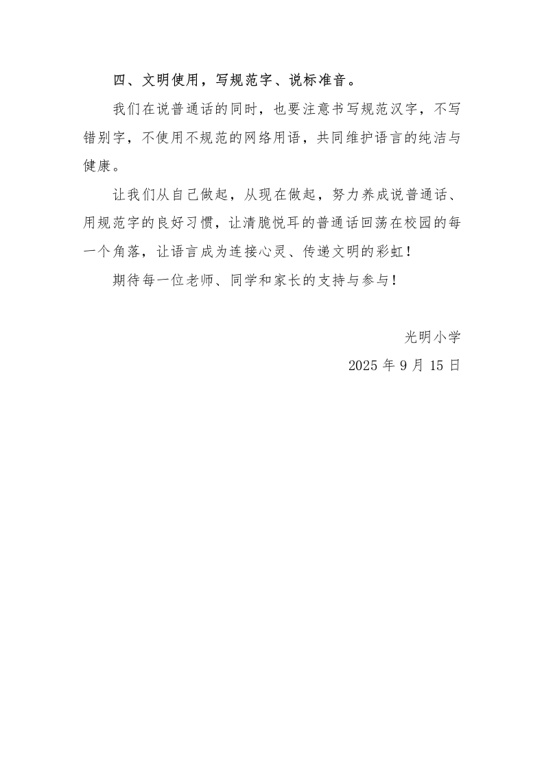 关于在全校推广普通话的倡议书亲爱的老师们、同学们,尊敬的家长朋友们:普通话是我们国家的通用语言,是中华民族文化交流的纽带,也是我们走向更广阔天地的桥梁。在学校里,说好普通话不仅有助于我们更清晰地表达思想、更顺畅地交流知识,还能增强我们对中华优秀文化的认同感和自豪感。每年一度的“推广普通话宣传周”即将到来,为此,我们向全校师生及家长发出如下倡议:一、师生携手,课堂内外讲普通话。老师们应以身作则,无论在教学还是日常与学生的沟通中,自觉使用普通话:同学们在课堂上回答问题、讨论问题,在校园中与老师、同学交流,也请积极使用普通话,让普通话成为我们的校园语言。二、家庭参与,亲子共学普通话。希望家长朋友们在家中也尽量用普通话与孩子交流,营造良好的语言环境,鼓励孩子多讲普通话,共同感受普通话的规范与优美。三、积极实践,活动推广普通话。各班可组织开展形式多样的推普活动,如朗诵会、演讲比赛、故事会等,在活动中锻炼表达能力,体验普通话的音韵之美。
