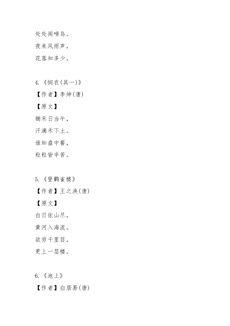 XX小学第28届推广普通话:三年级诗词朗诵会参考诗词晨晨老师2个月前发布关注私信12.14KB4页0325 以下为资料部分截图预览,下载后为超高清原文件。 第1页 / 共4页 第2页 / 共4页 试读已结束,还剩2页,您可下载完整版后进行离线阅读 加入VIP,享海量教务资料,无限制免费下载所有材料 XX小学第28届推广普通话:三年级诗词朗诵会参考诗词此内容为付费资源,请付费后查看¥9.99¥15.99VIP会员免费代理(享70%分佣)免费立即购买您当前未登录!建议登陆后购买,可保存购买订单付费资源© 版权声明文章版权归作者所有,未经允许请勿转载。THE END学校活动 文本预览 适合小学三年级朗诵的唐诗宋词参考1.《咏鹅》【作者】骆宾王(唐)【原文】鹅,鹅,鹅,曲项向天歌。白毛浮绿水,红掌拨清波。2.《静夜思》【作者】李白(唐)【原文】床前明月光,疑是地上霜。举头望明月,低头思故乡。3.《春晓》【作者】孟浩然(唐)【原文】春眠不觉晓, 查看更多 收起部分 喜欢就支持一下吧点赞5 分享QQ空间微博QQ好友海报分享复制链接收藏