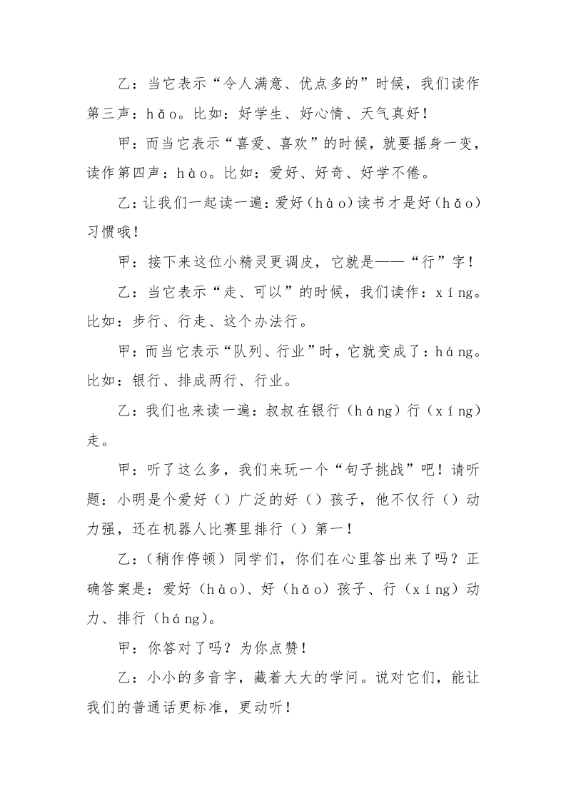 XX小学第28届推广普通话广播稿:“童声广播站”晨晨老师2个月前发布关注私信22.18KB15页02412 以下为资料部分截图预览,下载后为超高清原文件。 第1页 / 共15页 第2页 / 共15页 试读已结束,还剩13页,您可下载完整版后进行离线阅读 加入VIP,享海量教务资料,无限制免费下载所有材料 XX小学第28届推广普通话广播稿:“童声广播站”此内容为付费资源,请付费后查看¥9.99¥15.99VIP会员免费代理(享70%分佣)免费立即购买您当前未登录!建议登陆后购买,可保存购买订单付费资源© 版权声明文章版权归作者所有,未经允许请勿转载。THE END学校活动 文本预览 光明小学“童声广播站”广播稿日期:2025年9月15日(星期一)栏目:普通话小课堂主题:趣味多音字播音员:(甲)、(乙)甲:尊敬的老师们!乙:亲爱的同学们!合:大家下午好!甲:这里是光明小学“童声广播站”,我是播音员(甲)。乙:我是播音员(乙)。伴随着熟悉的音乐,“雅言传承文明,经典浸润人生”推广普通话活动周今天正式拉开帷幕啦!甲:从今天起,每天下午的这个时间,我们都将“语”你相约,用动听的声音,带领大家畅游语言的海洋,感受普通话的魅力。乙:没错!本周我们的第一课,就是大家既熟悉又头疼的朋友一一多音字!它们就像会“变装”的小精灵,在不同的词语里,会换上不同的读音和表情。甲:首先登场的第一位“变装小精灵”是一一“好”字!大家准备好了吗? 查看更多 收起部分 喜欢就支持一下吧点赞12 分享QQ空间微博QQ好友海报分享复制链接收藏