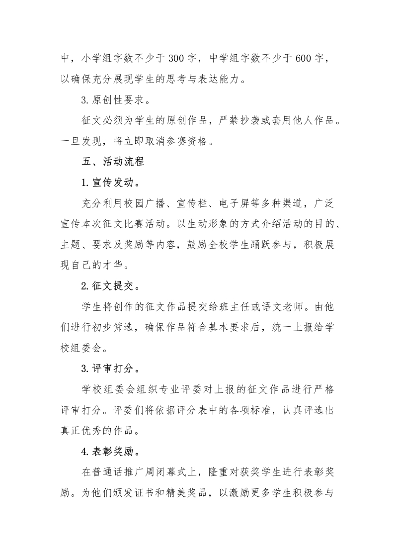 第28届全国推广普通话宣传周学校征文比赛活动方案:我心中的桥梁晨晨老师2个月前发布关注私信0.31MB4页03913 以下为资料部分截图预览,下载后为超高清原文件。 第1页 / 共4页 第2页 / 共4页 试读已结束,还剩2页,您可下载完整版后进行离线阅读 加入VIP,享海量教务资料,无限制免费下载所有材料 第28届全国推广普通话宣传周学校征文比赛活动方案:我心中的桥梁此内容为付费资源,请付费后查看¥9.99¥15.99VIP会员免费代理(享70%分佣)免费立即购买您当前未登录!建议登陆后购买,可保存购买订单付费资源© 版权声明文章版权归作者所有,未经允许请勿转载。THE END学校活动 文本预览 第28届全国推广普通话宣传周学校征文比赛活动方案一、活动目的第28届全国推广普通话宣传周,这一重要节点,以征文比赛为载体,充分激发中小学生对普通话学习的浓厚热情。一方面,切实提升他们的语言表达能力与创作能力,为其未来的学习与发展奠定坚实基础:另一方面,积极推动校园文化的蓬勃繁荣,营造更加浓厚的文化氛围。二、活动主题“普通话,我心中的桥梁”三、参赛对象全校中小学生,依据不同学习阶段分为小学组和中学组展开角逐。四、征文要求1.内容要求。紧密围绕“普通话,我心中的桥梁”这一主题,深度结合个人在学习、生活或是社会实践中的独特体会与深刻感悟,用心撰写一篇征文。内容务必积极向上,充满真情实感,能够引起读者的共鸣。2.形式要求。征文题目由学生自主拟定,文体不限(诗歌除外)。其 查看更多 收起部分 喜欢就支持一下吧点赞13 分享QQ空间微博QQ好友海报分享复制链接收藏