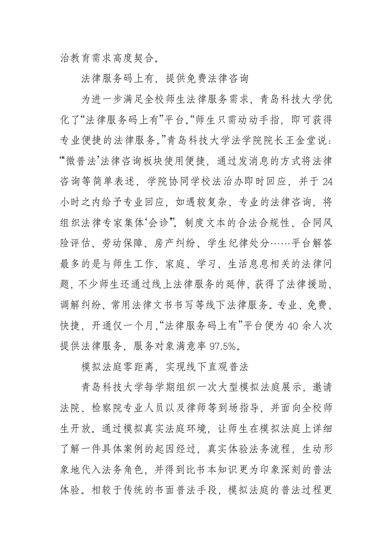 青岛科技大学:组建“微普法”服务团,师生学法用法更便捷晨晨老师2个月前发布关注私信13.45KB4页04411 以下为资料部分截图预览,下载后为超高清原文件。 第1页 / 共4页 第2页 / 共4页 试读已结束,还剩2页,您可下载完整版后进行离线阅读 加入VIP,享海量教务资料,无限制免费下载所有材料 青岛科技大学:组建“微普法”服务团,师生学法用法更便捷此内容为付费资源,请付费后查看¥9.99¥15.99VIP会员免费代理(享70%分佣)免费立即购买您当前未登录!建议登陆后购买,可保存购买订单付费资源© 版权声明文章版权归作者所有,未经允许请勿转载。THE END综合资料 文本预览 青岛科技大学:组建“微普法”服务团,师生学法用法更便捷为将学习贯彻习近平新时代中国特色社会主义思想主题教育成果转化为守护平安的生动实践,以实际行动助力“特色鲜明、走在前列”的高水平大学建设,青岛科技大学法学院发挥专业和新媒体优势,组建了由70余名师生参与的“微普法”服务团,大力实施“微”普法,以期打造法治宣传教育特色品牌,为师生提供更多、更便捷、更新颖的学法、用法渠道。普法课堂今日说,提高师生法治观念学校组织法学院师生、法治工作办公室、校外社会实践指导教师等法律专业服务人员,结合近期社会热点案件整理、编写“微”案例,用最精炼的语言、最短小的篇幅阐述案件中涉及的法律法规、普及该法律法规的适用条件。相关热点案例以“普法课堂今日说”为栏目通过“青科大法学院”微信公众号发布,每2天一期。截至目前,共发布高考作弊、知识产权、网络虚拟财产、诚信考试等相关主题普法案例10余篇。值得一提的是,“微普法”服务团三分之二的人员为在校学生,这是法学青年学子坚持全面依法治国、推进法治中国建设的一次有益尝试,充分体现了学校对新时势下普法教育工作新要求的准确把握和高位谋划。下一步,学校将继续提升大学生志愿参与普法工作的针对性与实效性,实现宣讲成效与法 查看更多 收起部分 喜欢就支持一下吧点赞11 分享QQ空间微博QQ好友海报分享复制链接收藏