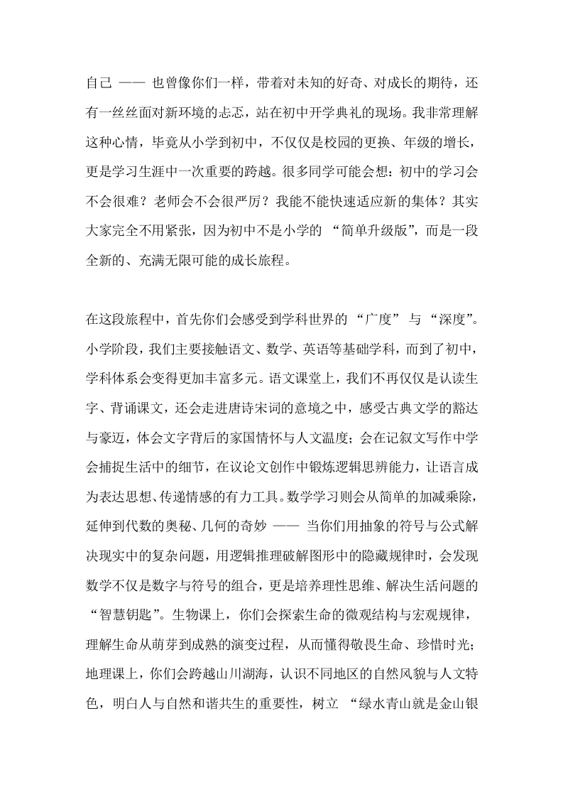 2025级新初一,分管教学副校长发言:开启初中新旅,书写成长华章晨晨老师2个月前发布关注私信17.60KB8页0339 以下为资料部分截图预览,下载后为超高清原文件。 第1页 / 共8页 第2页 / 共8页 试读已结束,还剩6页,您可下载完整版后进行离线阅读 加入VIP,享海量教务资料,无限制免费下载所有材料 2025级新初一,分管教学副校长发言:开启初中新旅,书写成长华章此内容为付费资源,请付费后查看¥9.99¥15.99VIP会员免费代理(享70%分佣)免费立即购买您当前未登录!建议登陆后购买,可保存购买订单付费资源© 版权声明文章版权归作者所有,未经允许请勿转载。THE END校长讲话 文本预览 2025级新初一,分管教学副校长发言:开启初中新旅,书写成长华章尊敬的各位老师、家长,亲爱的新初一同学们:大家上午好!当清晨的第一缕阳光越过校园的梧桐树梢,洒在崭新的塑胶跑道上:当微凉的秋风拂过教学楼前的月季花丛,带来阵阵沁人心脾的芬芳:当一张张带着稚气却满含憧憬的脸庞,在校园门口有序列队,好奇地打量着这座即将陪伴大家三年的成长乐园一一我们知道,属于2025级初一新生的美好旅程,正式拉开了序幕。在这个金秋送爽、丹桂飘香的季节,空气中不仅弥漫着丰收的喜悦,更涌动着蓬勃的生机。首先,请允许我代表学校教学部门,向各位刚刚告别小学、踏入初中校园的新同学,致以最热烈、最诚挚的欢迎!你们的到来,为这所有着数十年办学历史的学校注入了新鲜血液,让每一间教室、每一条走廊都焕发出新的活力。同时,也向始终陪伴在同学们身边,为你们的成长默默付出辛劳的家长朋友们,以及在小学阶段为你们打下坚实基础的老师们,道一声最衷心的感谢!正是因为有了你们的守护与耕耘,才有了同学们今天自信迈向新征程的勇气。今天站在这里,看着台下同学们亮晶晶的眼睛,我仿佛看到了曾经的 查看更多 收起部分 喜欢就支持一下吧点赞9 分享QQ空间微博QQ好友海报分享复制链接收藏