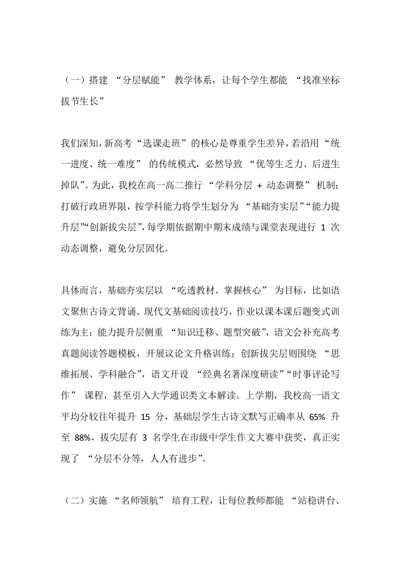 高中校长在教育高质量发展座谈会上发言:聚力破局解难题,守正提质育新人晨晨老师2个月前发布关注私信18.22KB10页04810 以下为资料部分截图预览,下载后为超高清原文件。 第1页 / 共10页 第2页 / 共10页 试读已结束,还剩8页,您可下载完整版后进行离线阅读 加入VIP,享海量教务资料,无限制免费下载所有材料 高中校长在教育高质量发展座谈会上发言:聚力破局解难题,守正提质育新人此内容为付费资源,请付费后查看¥9.99¥15.99VIP会员免费代理(享70%分佣)免费立即购买您当前未登录!建议登陆后购买,可保存购买订单付费资源© 版权声明文章版权归作者所有,未经允许请勿转载。THE END校长讲话 文本预览 高中校长在教育高质量发展座谈会上发言:聚力破局解难题,守正提质育新人尊敬的各位领导、同仁:大家好!在新高考改革深化推进、“双减”政策向高中阶段延伸的关键节点,能与各位齐聚一堂共话xx高中教育高质量发展,既是思想碰撞的难得契机,更是凝聚育人共识的重要平台。作为扎根一线的学校管理者,我始终坚信:高中教育如同培育一片森林,既要深耕土壤筑牢根系(对应基础育人),也要修枝固本抵御风雨(应对改革挑战),更要静待每棵树木按其节奏拔节生长(尊重学生个性)。接下来,我将从实践举措、现存瓶颈、攻坚方向三个维度,分享我校的探索与思考,恳请各位批评指正。一、锚定根基:以“三维实践”夯实育人质量底盘质量是高中教育的立身之本,如同农耕者侍弄田地,唯有循时而作、精耕细作,方能收获丰稔之果。近年来,我校紧扣“教有温度、学有深度、考有效度”的育人目标,推出三项核心举措,推动教育质量实现阶梯式提升。 查看更多 收起部分 喜欢就支持一下吧点赞10 分享QQ空间微博QQ好友海报分享复制链接收藏