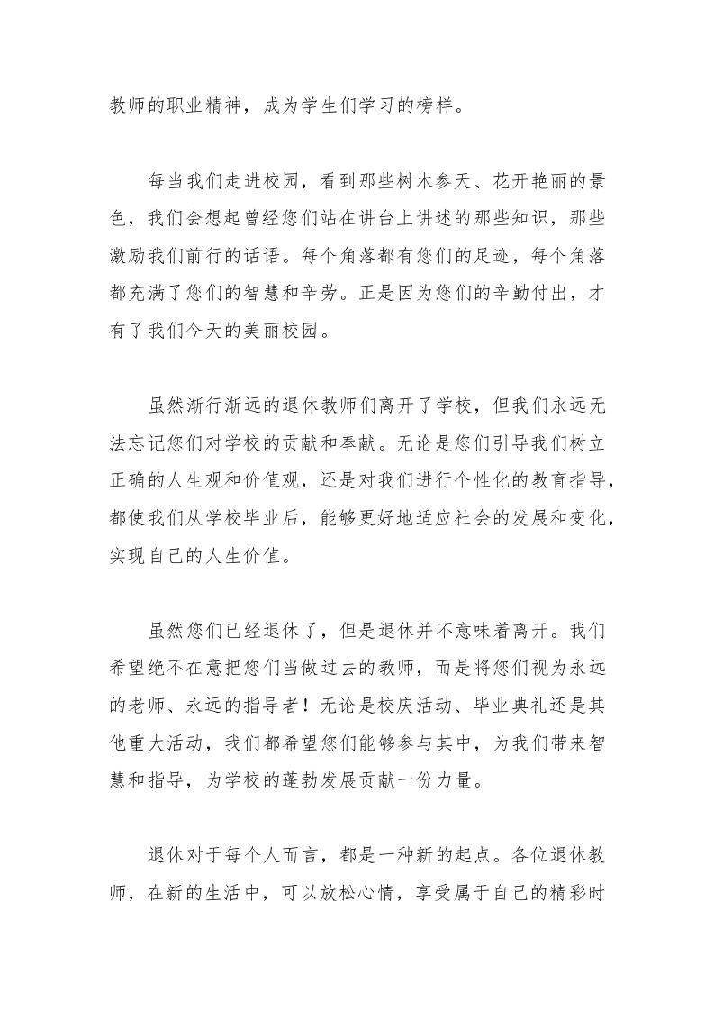 教师退休座谈会主持词晨晨老师2个月前发布关注私信12.66KB3页04115 以下为资料部分截图预览,下载后为超高清原文件。 第1页 / 共3页 第2页 / 共3页 试读已结束,还剩1页,您可下载完整版后进行离线阅读 加入VIP,享海量教务资料,无限制免费下载所有材料 教师退休座谈会主持词此内容为付费资源,请付费后查看¥9.99¥15.99VIP会员免费代理(享70%分佣)免费立即购买您当前未登录!建议登陆后购买,可保存购买订单付费资源© 版权声明文章版权归作者所有,未经允许请勿转载。THE END校长讲话 文本预览 教师退休座谈会主持词尊敬的各位退休教师、来宾们:大家好!首先,我代表整个学校的师生们,对各位退休教师们表示最诚挚的欢迎和敬意!感谢各位多年来为学校的发展和学生成长做出的辛勤努力和无私奉献!为了庆祝各位退休教师进入新的生活阶段,为了与大家共同回忆过去、展望未来,我们特意组织了这次退休座谈会。回首昔日的往事,我们不禁感慨万千。在几十年的教育教学生涯中,各位退休教师以自己的智慧和汗水,为一代又一代学生播下了希望的种子,教育了一批又一批优秀的学子。同学们在您们的指导下,走向社会之后在各个领域扬名立万,这是您们最为引以为豪的成就!正是有了你们的智慧和教诲,我们的学校才不断发展壮大。作为退休教师们,您们的辛勤耕耘,建立起了我们现在的辉煌,为学校培养了无数的栋梁之材。无论是繁忙的课堂,还是深夜的备课,您们始终如一地付出,用实际行动诠释了 查看更多 收起部分 喜欢就支持一下吧点赞15 分享QQ空间微博QQ好友海报分享复制链接收藏