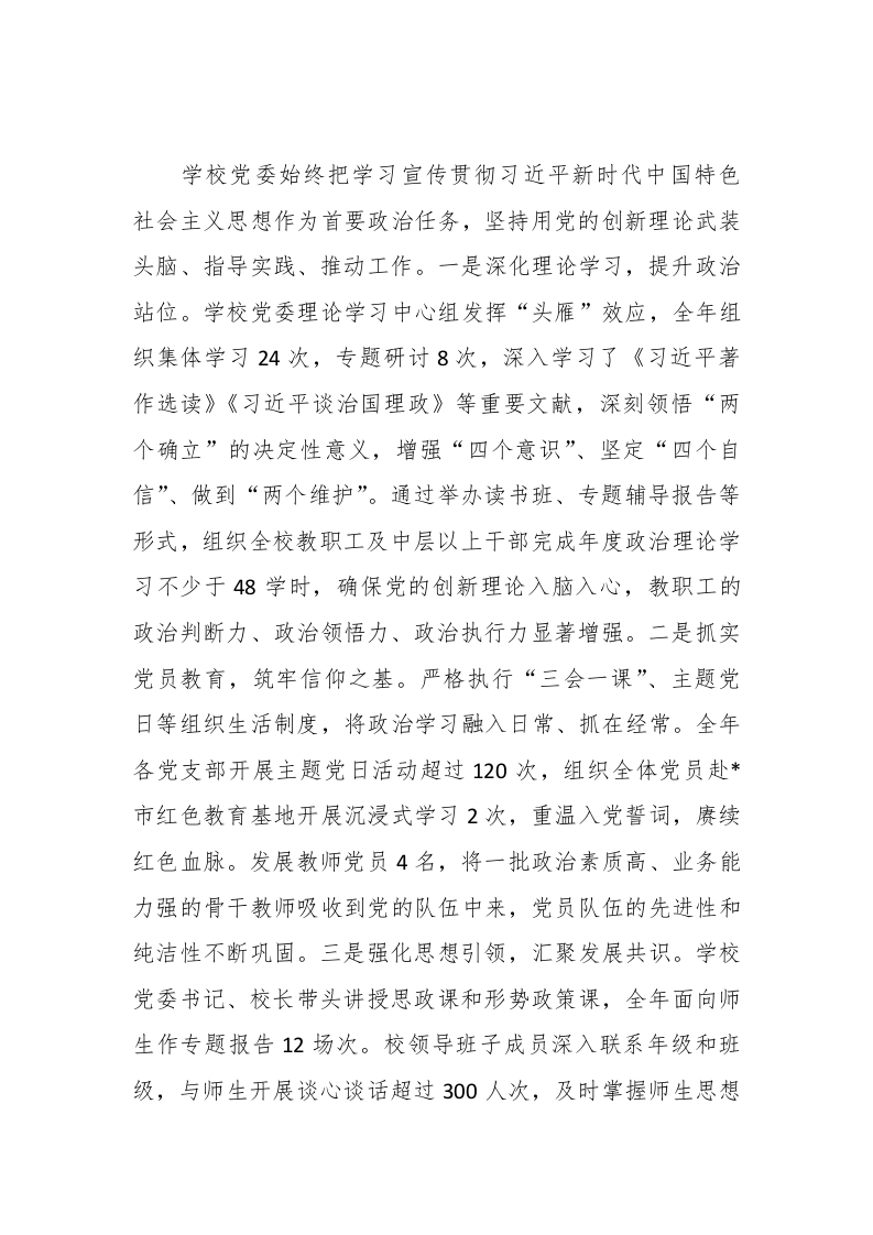 某高中2025年度意识形态工作总结晨晨老师2个月前更新关注私信17.75KB9页03515 以下为资料部分截图预览,下载后为超高清原文件。 第1页 / 共9页 第2页 / 共9页 试读已结束,还剩7页,您可下载完整版后进行离线阅读 加入VIP,享海量教务资料,无限制免费下载所有材料 © 版权声明文章版权归作者所有,未经允许请勿转载。THE END计划总结讲稿讲话 文本预览 某高中2025年度意识形态工作总结2025年是全面完成“十四五”规划的收官之年,也是我校深化教育教学改革、谋划未来发展的关键之年。一年来,学校党委坚持以习近平新时代中国特色社会主义思想为指导,深入学习贯彻党的二十大及党的二十届三中全会精神,全面贯彻党的教育方针,将意识形态工作作为一项极端重要的战略性、基础性工作来抓,严格落实意识形态工作责任制,牢牢把握工作的领导权、管理权和话语权,为推动学校高质量内涵式发展提供了坚强思想保证和强大精神动力。现将全年工作总结如下。一、全年工作总体回顾与主要成效2025年,在*市委、市教育工委的坚强领导下,我校意识形态领域总体形势持续稳定向好。学校党委认真履行管党治党、办学治校主体责任,坚持党建引领,聚焦主责主业,全校上下思想统一、步调一致,形成了凝心聚力、共谋发展的良好局面。(一)坚持政治铸魂,理论武装根基持续夯实 查看更多 收起部分 喜欢就支持一下吧点赞15 分享QQ空间微博QQ好友海报分享复制链接收藏