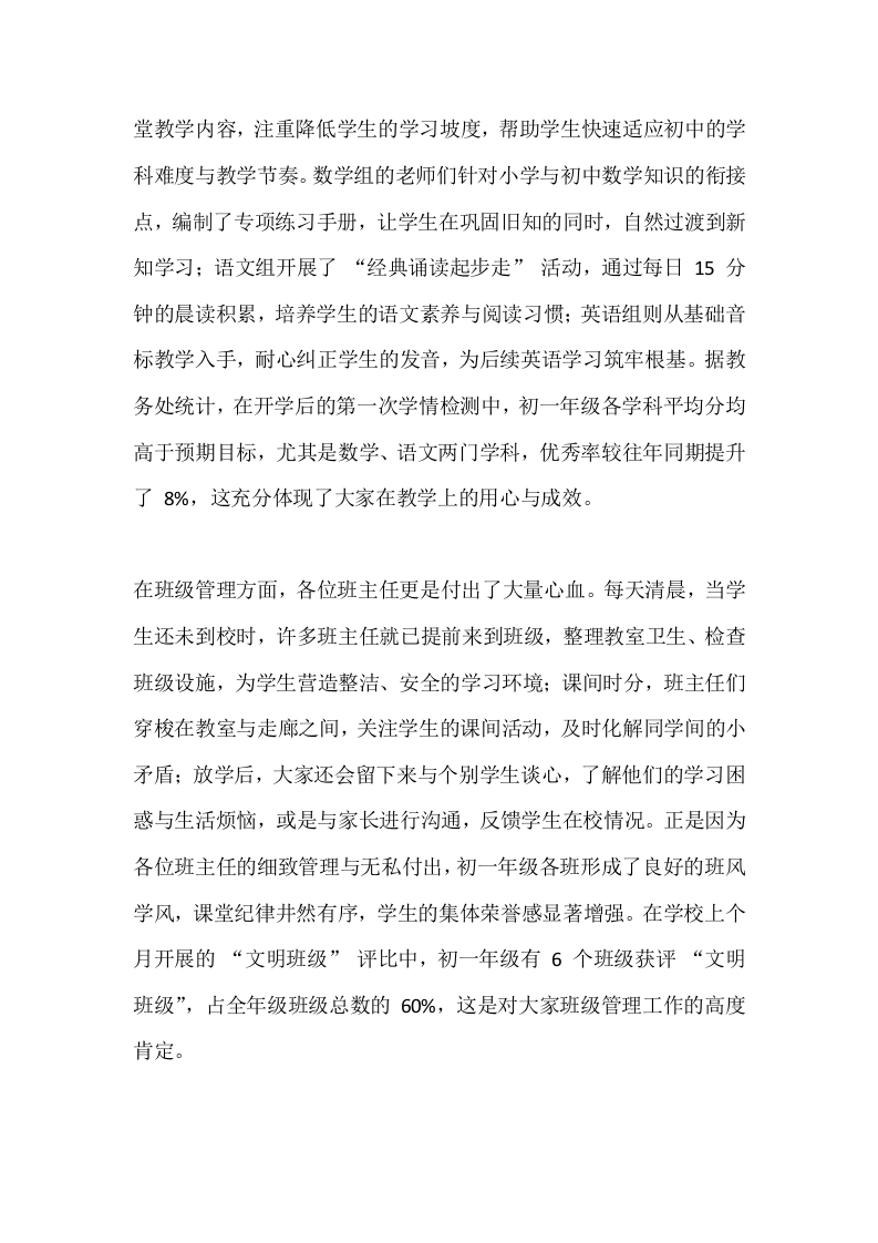 初一年级组全体教师大会上,校长讲话_:聚焦初一关键期,共绘育人新篇章晨晨老师2个月前发布关注私信17.39KB10页04015 以下为资料部分截图预览,下载后为超高清原文件。 第1页 / 共10页 第2页 / 共10页 试读已结束,还剩8页,您可下载完整版后进行离线阅读 加入VIP,享海量教务资料,无限制免费下载所有材料 初一年级组全体教师大会上,校长讲话_:聚焦初一关键期,共绘育人新篇章此内容为付费资源,请付费后查看¥9.99¥15.99VIP会员免费代理(享70%分佣)免费立即购买您当前未登录!建议登陆后购买,可保存购买订单付费资源© 版权声明文章版权归作者所有,未经允许请勿转载。THE END校长讲话 文本预览 初一年级组全体教师大会上,校长讲话:聚焦初一关键期,共绘育人新篇章各位初一年级的老师们:大家好!今天,我们齐聚一堂召开初一年级组全体教师大会,既是对过去一段时间工作的梳理与总结,也是为了明确接下来的目标与方向,凝聚力量共同推动初一年级教育教学工作再上新台阶。初一年级是学生从小学向初中过渡的关键阶段,学生的学习习惯、行为规范、心理状态都在这一时期发生重要转变,在座每一位老师的付出,都直接关系着学生能否平稳适应初中生活,为未来三年的学习打下坚实基础。接下来,我将从五个方面与大家交流探讨。一、回顾过往:初一年级组的坚实足迹自开学以来,初一年级组全体教师秉持着“以生为本”的教育理念,兢兢业业、默默奉献,在教育教学、班级管理、学生成长等方面取得了显著成效。在教学工作上,各位老师深入研究小升初衔接教学策略,精心设计课 查看更多 收起部分 喜欢就支持一下吧点赞15 分享QQ空间微博QQ好友海报分享复制链接收藏