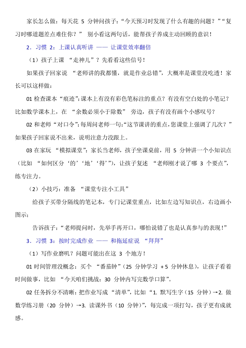 良好的习惯是孩子成长的灯塔发言稿有ppt晨晨老师2个月前发布关注私信18.69KB6页04313 以下为资料部分截图预览,下载后为超高清原文件。 第1页 / 共6页 第2页 / 共6页 试读已结束,还剩4页,您可下载完整版后进行离线阅读 加入VIP,享海量教务资料,无限制免费下载所有材料 良好的习惯是孩子成长的灯塔发言稿有ppt此内容为付费资源,请付费后查看¥9.99¥15.99VIP会员免费代理(享70%分佣)免费立即购买您当前未登录!建议登陆后购买,可保存购买订单付费资源© 版权声明文章版权归作者所有,未经允许请勿转载。THE END校长讲话 文本预览 《好习惯,孩子成长的灯塔》家长会-发言稿今天在孩子习惯上花10分钟,胜过未来在成绩上补100小时。各位家长朋友,咱们先聊个话题:您有没有发现,同样是上课,有的孩子笔记工工整整,有的孩子课本皱巴巴像被“揉烂的馒头”?同样是写作业,有的孩子半小时搞定,有的孩子磨磨蹭蹭到晚上10点还在咬笔杆?这背后啊,全是习惯在“搞事情”!小学阶段的核心任务:不是考100分,而是帮孩子种下5棵“习惯小树苗”一学习习惯、思考习惯、阅读习惯、时间习惯、独立习惯。第一部分:学习习惯培养一地基打稳,房子才牢1.幻灯片3:习惯1:做好预习和复习一一给学习装“导航仪”(1)啥是预习?不是随便翻两页书!预习三步法(家长可在家引导):01读课本:语文读课文3遍,圈出生字:数学看例题,用问号标出看不懂的地方(比如:“为什么要先算括号里的?”)。02查资料:不会的生字查字典,标上拼音;数学概念查生活例子(比如“平行四边形”,想想家里的伸缩衣架)。03记问题:让孩子准备“预习小本本”,写下“我不懂的3件事”,比如“古诗里的‘推敲’是什么意思?”(2)复习怎么抓重点?抓住“黄金24小时”!当天作业前,花10分钟让孩子:语文:默写当天学的生字,背一段课文:数学:复述老师讲的公式(比如“长方形面积=长×宽”),做1道课堂例题的同类题;工具推荐:用“思维导图”画课文结构,或用“错题拍照法”(把错题拍下来,周末集中复盘)。 查看更多 收起部分 喜欢就支持一下吧点赞13 分享QQ空间微博QQ好友海报分享复制链接收藏