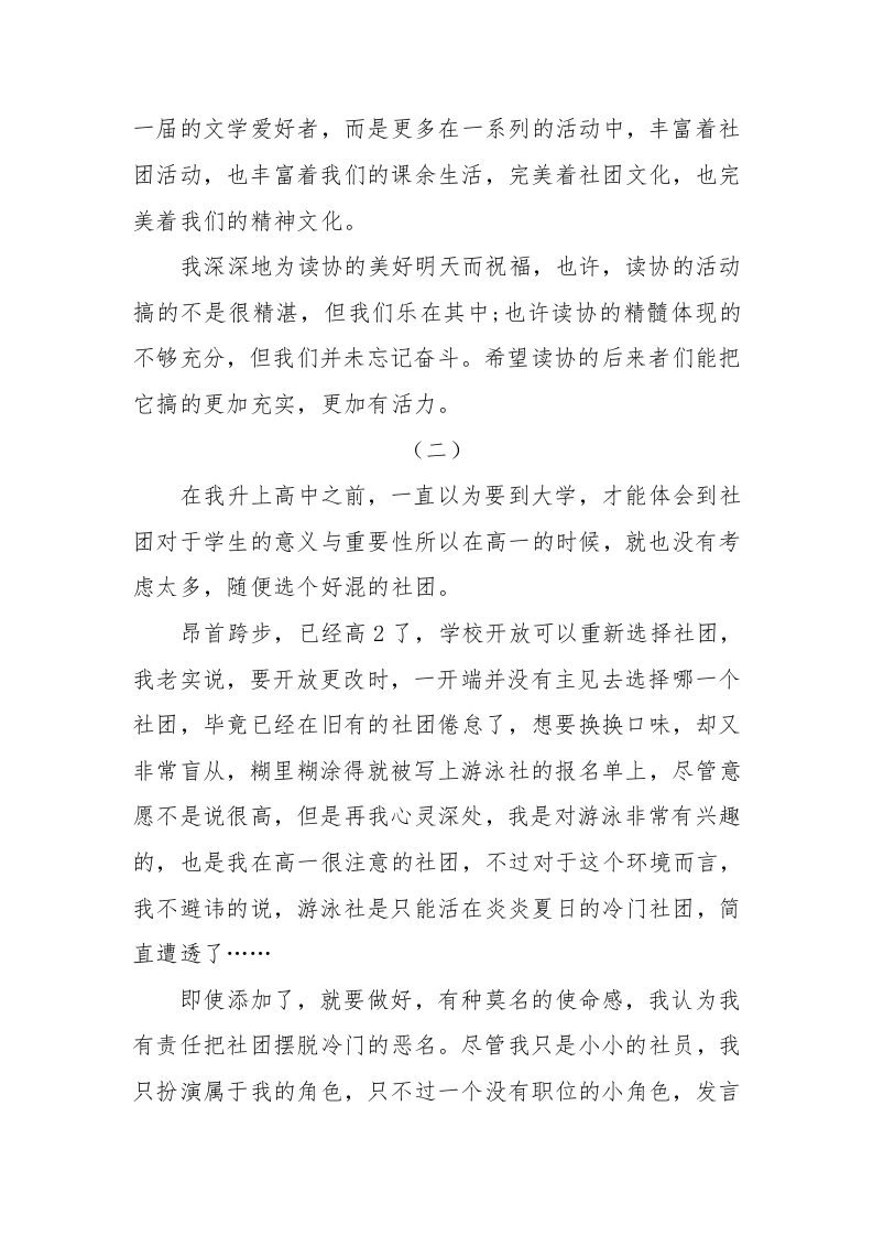 社团活动心得体会(3篇)晨晨老师2个月前发布关注私信14.38KB5页0415 以下为资料部分截图预览,下载后为超高清原文件。 第1页 / 共5页 第2页 / 共5页 试读已结束,还剩3页,您可下载完整版后进行离线阅读 加入VIP,享海量教务资料,无限制免费下载所有材料 社团活动心得体会(3篇)此内容为付费资源,请付费后查看¥9.99¥15.99VIP会员免费代理(享70%分佣)免费立即购买您当前未登录!建议登陆后购买,可保存购买订单付费资源© 版权声明文章版权归作者所有,未经允许请勿转载。THE END校长讲话 文本预览 社团活动心得体会3篇(一)大学伊始,逢校社团招员,在众多的社团中,我唯读书协会情有独钟,读书协会,顾名思义,这是一个学术性的社团,在学习中探索,在文学中讨论,在写作中历练,从而不断提高自身的文学修养与内涵,在中学时代就酷爱文学的我,因为当时客观条件的影响,并未对文学有过更深层的探知,而进入大学有丰富的课余生活可以自由安排,而读书协会正好可以提供这个学习充实的平台。大一时,一直积极参加社团活动,曾担任读协的办公室干事,做事认真有责任,努力完成社团交给我的任务,在丰富了学习交流之余,更大的收获是结识了许多朋友和积累很多宝贵的工作经验,至第一学年结束时,被评为读书协会“社团活动积极分子”。至大二,本人担任了读协的办公室主任,主要从事负责传达社团内各个部门及会员信息安排回忆,活动,收发会员资料等工作,学期初始,为迎接新生,忙于招社团新员,整理新会员资料,选出社团新一届干事,以前自己还是的时候,就只是努力完成了社团交给我的任务就好了,而现在所有的困难都摆在了面前,感到任务的繁杂,但累并快乐着。经过近一年的与读协的共成长,我们收获的不仅仅是新 查看更多 收起部分 喜欢就支持一下吧点赞5 分享QQ空间微博QQ好友海报分享复制链接收藏
