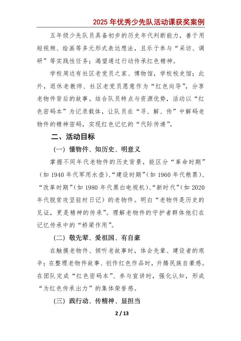时光里的红色密码本——2025年优秀少先队活动课获奖案例晨晨老师2个月前发布关注私信28.98KB13页05114 以下为资料部分截图预览,下载后为超高清原文件。 第1页 / 共13页 第2页 / 共13页 试读已结束,还剩11页,您可下载完整版后进行离线阅读 加入VIP,享海量教务资料,无限制免费下载所有材料 时光里的红色密码本——2025年优秀少先队活动课获奖案例此内容为付费资源,请付费后查看¥9.99¥15.99VIP会员免费代理(享70%分佣)免费立即购买您当前未登录!建议登陆后购买,可保存购买订单付费资源© 版权声明文章版权归作者所有,未经允许请勿转载。THE END校长讲话 文本预览 2025年优秀少先队活动课获奖案例时光里的密码本,红色记忆的传承老物件·新故事少年说一、活动背景(一)主题解析“每一件老物件,都是凝固的历史;每一段红色记忆,都是民族的脊梁。”“要把红色资源利用好、把红色传统发扬好、把红色基因传承好”。从抗美援朝的水壶到改革开放的粮票,从知青下乡的煤油灯到脱贫攻坚的驻村日记,老物件作为“可触摸的红色载体”,承载着革命先辈的奋斗精神、建设时期的拼搏意志、新时代的担当力量。当前,少年儿童成长于数字化时代,对“粮票如何用”“煤油灯怎么点亮”等历史场景缺乏直观认知,红色记忆多停留在课本文字层面,难以产生情感共鸣。为此,我们设计《时光里的红色密码本》主题活动,以“老物件”为核心线索,让少先队员化身“红色密码员”,通过“找物件、挖故事、传记忆”的沉浸式体验,打破“历史与当下”的时空壁垒,让红色记忆从“书本里”走进“生活中”,从“听说过”变为“讲得出、守得住”,最终将“红色基因”内化为成长路上的精神动力。(二)队情分析1/13 查看更多 收起部分 喜欢就支持一下吧点赞14 分享QQ空间微博QQ好友海报分享复制链接收藏