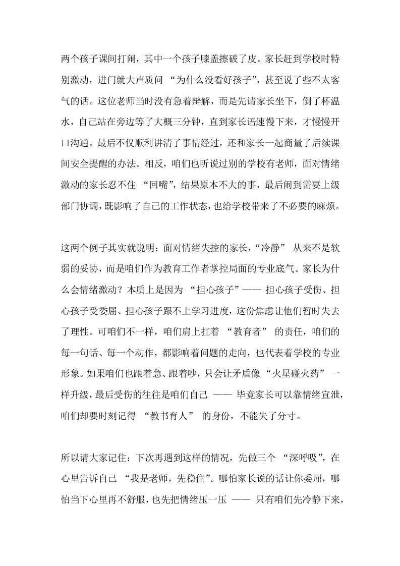 校长在全体教师大会上精彩发言:化解家校沟通矛盾,做有智慧、有底气的教育同行者晨晨老师2个月前发布关注私信18.48KB10页02313 以下为资料部分截图预览,下载后为超高清原文件。 第1页 / 共10页 第2页 / 共10页 试读已结束,还剩8页,您可下载完整版后进行离线阅读 加入VIP,享海量教务资料,无限制免费下载所有材料 校长在全体教师大会上精彩发言:化解家校沟通矛盾,做有智慧、有底气的教育同行者此内容为付费资源,请付费后查看¥9.99¥15.99VIP会员免费代理(享70%分佣)免费立即购买您当前未登录!建议登陆后购买,可保存购买订单付费资源© 版权声明文章版权归作者所有,未经允许请勿转载。THE END校长讲话 文本预览 校长在全体教师大会上精彩发言:化解家校沟通矛盾,做有智慧、有底气的教育同行者各位老师:新学期的铃声己经清脆响起,看着孩子们背着书包、带着笑容重返校园,咱们每一位教育者心里都透着一股暖意一一这是新的开始,也是咱们与家长再度携手、共赴育人使命的新征程。在咱们日复一日的工作里,备课、上课、批改作业是常态,而家校沟通则是贯穿其中的“必修课”。可这份“必修课”往往不那么容易:可能是课间孩子追逐时不小心磕碰到,家长急匆匆赶来时眼里满是焦虑;可能是单元测验后孩子成绩波动,家长拿着试卷上门时语气带着急切:也可能是对咱们布置的分层作业、课堂批评方式有疑问,家长发来的消息里藏着不解与情绪。我知道,每当遇到家长带着情绪找上门,大家心里难免会委屈、会紧张,甚至会手足无措。今天,就想和大家好好聊聊,如何用专业智慧应对这些场景,既把矛盾化解在当下,又守护好咱们的教育初心、维护好合法权益,更让家校关系朝着“协同育人”的方向越走越顺。一、以冷静为基:克制不是妥协,是专业的底气与情绪的“压舱石”我先和大家分享一个去年的真实案例:咱们初二年级有位老师,班里 查看更多 收起部分 喜欢就支持一下吧点赞13 分享QQ空间微博QQ好友海报分享复制链接收藏