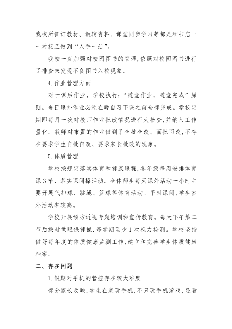 学校“五项管理”落实情况自查报告晨晨老师2个月前发布关注私信13.09KB4页0338 以下为资料部分截图预览,下载后为超高清原文件。 第1页 / 共4页 第2页 / 共4页 试读已结束,还剩2页,您可下载完整版后进行离线阅读 加入VIP,享海量教务资料,无限制免费下载所有材料 学校“五项管理”落实情况自查报告此内容为付费资源,请付费后查看¥9.99¥15.99VIP会员免费代理(享70%分佣)免费立即购买您当前未登录!建议登陆后购买,可保存购买订单付费资源© 版权声明文章版权归作者所有,未经允许请勿转载。THE END校长讲话 文本预览 学校“五项管理”落实情况自查报告为促进学生身心健康发展,落实教育部关于加强中小学生手机、睡眠、读物、作业、体质等“五项管理”的通知精神,我校依据文件要求对学校“五项管理”落实情况进行了自查,报告如下:一、五项管理工作落实情况1.手机管理学校无学生带手机到校园玩耍现象。严格落实不用手机布置作业,不布置需用手机的作业。对家长咨询作业项目的情况,教师与家长单独沟通。召开主题班会等形式,引导学生合理使用手机。通过家长群、家长会等渠道,提醒家长严控孩子玩手机,加强对手机的管理。2.睡眠管理经调查,学生在校起床时间最早部分为6:40,晚睡时间为9:50,最晚21:30分,即晚上休息最少有9个小时。学生在校时间超过九个小时。学校通过家长会、家长群等渠道,宣传充足的睡眠对少年儿童成长的重要性,告知家长保证学生按时睡觉。3.读物管理学校禁止通过举办讲座、培训等活动在校园内销售课外读物现象,不存在强制或变相强制学生购买课外读物的行为。 查看更多 收起部分 喜欢就支持一下吧点赞8 分享QQ空间微博QQ好友海报分享复制链接收藏