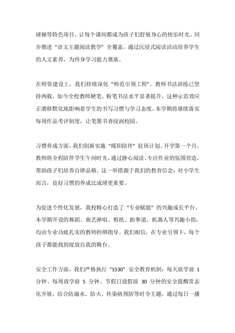 学校家长委员会会议,校长发言:家校同心筑根基,协同育人谱新篇晨晨老师2个月前发布关注私信13.37KB4页0478 以下为资料部分截图预览,下载后为超高清原文件。 第1页 / 共4页 第2页 / 共4页 试读已结束,还剩2页,您可下载完整版后进行离线阅读 加入VIP,享海量教务资料,无限制免费下载所有材料 学校家长委员会会议,校长发言:家校同心筑根基,协同育人谱新篇此内容为付费资源,请付费后查看¥9.99¥15.99VIP会员免费代理(享70%分佣)免费立即购买您当前未登录!建议登陆后购买,可保存购买订单付费资源© 版权声明文章版权归作者所有,未经允许请勿转载。THE END校长讲话 文本预览 学校家长委员会会议,校长发言:家校同心筑根基,协同育人谱新篇尊敬的各位家长委员:首先,请允许我以热烈的掌声,向在百忙之中莅临本次会议的各位教育同行者表示最诚挚的欢迎!感谢大家长期以来以理解为基石、以信任为纽带,为我校发展注入的温暖力量。在座的各位都是经各班精心推荐的杰出代表,你们不仅是学校公益事业的热心奉献者,更是推动教育发展的智慧智囊。今天,我们因共同的育人使命相聚于此,我谨代表全校教职员工向各位致以衷心的感谢和崇高的敬意。建校两年来,我校始终秉持"五育融合”的办学理念,在面对生源基础多元的挑战时,凭借扎实的管理体系、优良的师资队伍和勤勉务实的工作作风,实现了育人质量的稳步提升。我们先后斩获全县各类佳绩,这些成果的背后,既有全体教师的爱岗敬业,更离不开各位家长的鼎力支持与深度参与。接下来,我向各位汇报本学期的重点工作规划,这些举措将围绕"五育融合"理念展开:在全面发展方面,我们将构建"一校多品"的阳光体育生态。大课间在保留中华武术操和功夫书扇的基础上,各年级增设啦啦操、抖空竹、 查看更多 收起部分 喜欢就支持一下吧点赞8 分享QQ空间微博QQ好友海报分享复制链接收藏