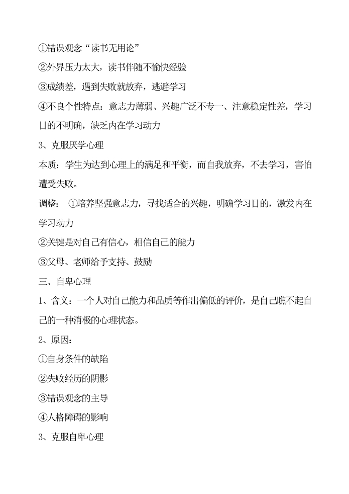 初高中心理健康教育:认识心理屏障晨晨老师2个月前更新关注私信16KB3页03411 以下为资料部分截图预览,下载后为超高清原文件。 第1页 / 共3页 第2页 / 共3页 试读已结束,还剩1页,您可下载完整版后进行离线阅读 加入VIP,享海量教务资料,无限制免费下载所有材料 © 版权声明文章版权归作者所有,未经允许请勿转载。THE END心理健康 文本预览 认识心理屏障,增强自我调适能力自卑向前一、逆反心理1、含义:客观要求与主观需要不相符合时所表现出的强烈抵触情绪。2、原因:①学生青春期心理特点:自尊心强自我中心好批评好争论②教师、家长:不了解学生心理特点,一味禁止压制3、克服逆反心理本质:通过表现出对他人的不遵从、抗拒来突出自我的某种需要或尊严,突出自我的独立性、自主性或存在价值。心理上还是进步向上的。调整:①用合理的方式来表现自己,珍惜机会,相信自己的能力,积极主动表现出来。②宽容、体谅父母老师二、厌学心理1、含义:个体对上学毫无兴趣,提起学习就头疼,厌恶、逃避学习。2、原因: 查看更多 收起部分 喜欢就支持一下吧点赞11 分享QQ空间微博QQ好友海报分享复制链接收藏