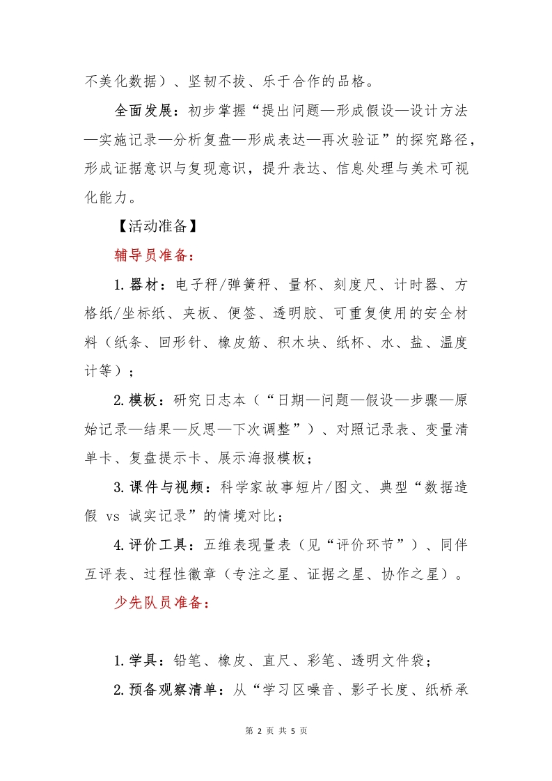 2025年少先队活动课案例:坐得住冷板凳晨晨老师2个月前更新关注私信21.44KB5页04510 以下为资料部分截图预览,下载后为超高清原文件。 第1页 / 共5页 第2页 / 共5页 试读已结束,还剩3页,您可下载完整版后进行离线阅读 加入VIP,享海量教务资料,无限制免费下载所有材料 © 版权声明文章版权归作者所有,未经允许请勿转载。THE END活动方案 文本预览 2025年少先队活动课案例一坐得住“冷”板凳(弘扬科学家精神)【活动背景】xxx报告强调教育、科技、人才是全面建设社会主义现代化国家的基础性、战略性支撑,并多次提出要大力弘扬以“淡泊名利、潜心研究、勇攀高峰”为核心的科学家精神。《少先队活动课程指导纲要(2021版)》明确提出,活动要突出政治性、组织性、实践性和儿童性,通过具体可感的活动情境培育队员的责任意识、问题意识与实践能力。信息爆炸与快节奏学习易诱发“浅尝辄止”的学习方式,队员耐心、专注与证据意识需要系统训练。【活动主题】坐得住“冷”板凳【活动对象】小学中高段【活动目标】政治启蒙:在认识“强国必先强科研”的过程中,形成尊重科学、崇尚奋斗的价值取向,树立报国理想。组织认同:在“研究小队”合作探究中,体验分工协作与规范操作,增强对少先队组织的归属与荣誉感。道德修养:在真实任务中学习诚实守信(如据实记录、第1页共5页 查看更多 收起部分 喜欢就支持一下吧点赞10 分享QQ空间微博QQ好友海报分享复制链接收藏