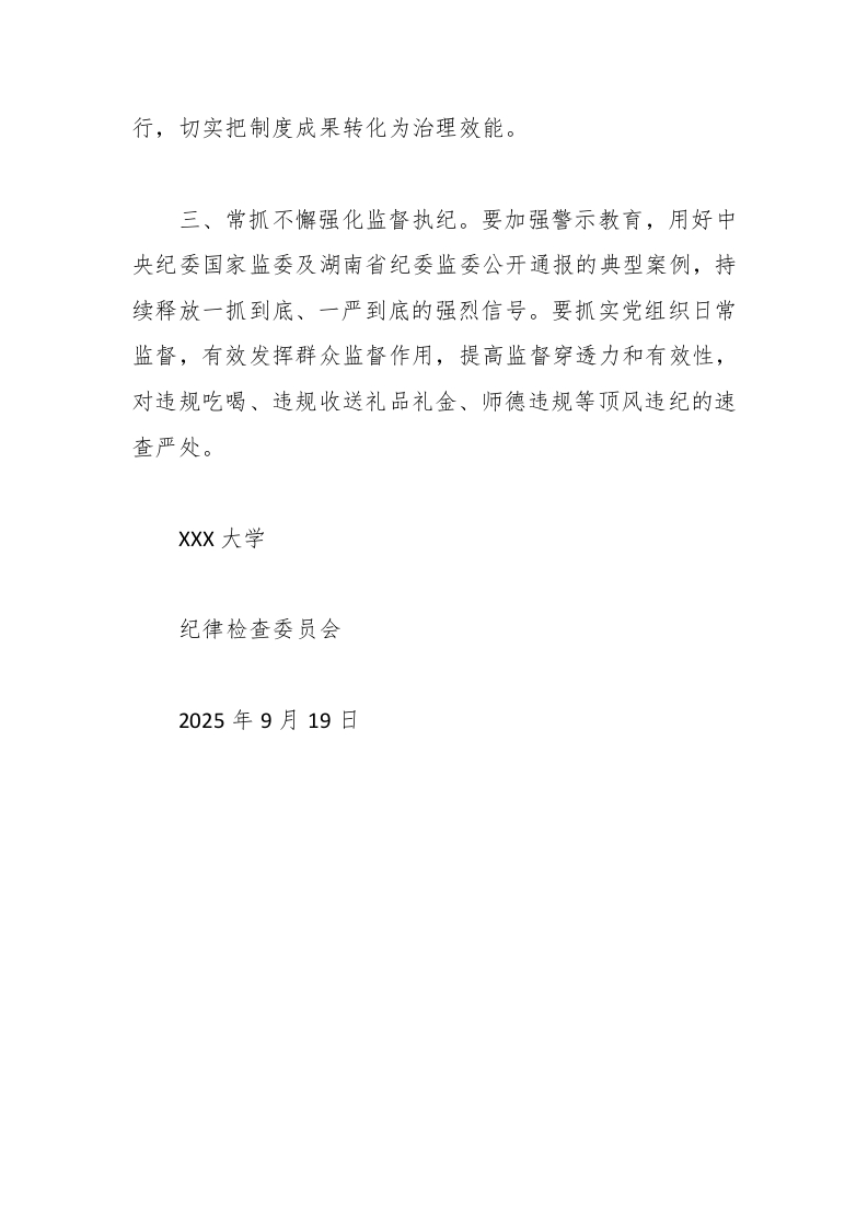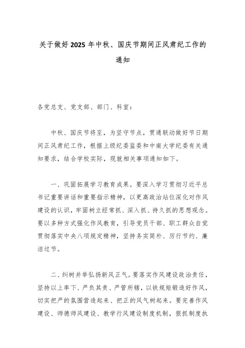 关于做好2025年中秋、国庆节期间正风肃纪工作的通知各党总支、党支部、部门、科室:中秋、国庆节将至,为坚守节点,贯通联动做好节日期间正风肃纪工作,根据上级纪委监委和中南大学纪委有关通知要求,结合学校实际,现就相关事项通知如下。一、巩固拓展学习教育成果。要深入学习贯彻习近平总书记重要讲话和重要指示精神,以更高政治站位深化对作风建设的认识,牢固树立经常抓、深入抓、持久抓的思想观念。要以多种方式强化作风教育,引导党员干部、职工群众自觉贯彻落实中央八项规定精神,坚持务实简朴、厉行节约、廉洁过节。二、纠树并举弘扬新风正气。要落实作风建设政治责任,坚持以上率下、严负其责、严管所辖,以铁规矩锻造好作风,切实把严的氛围营造起来、把正的风气树起来。要完善作风建设、师德师风建设、教学行风建设制度机制,狠抓制度执
