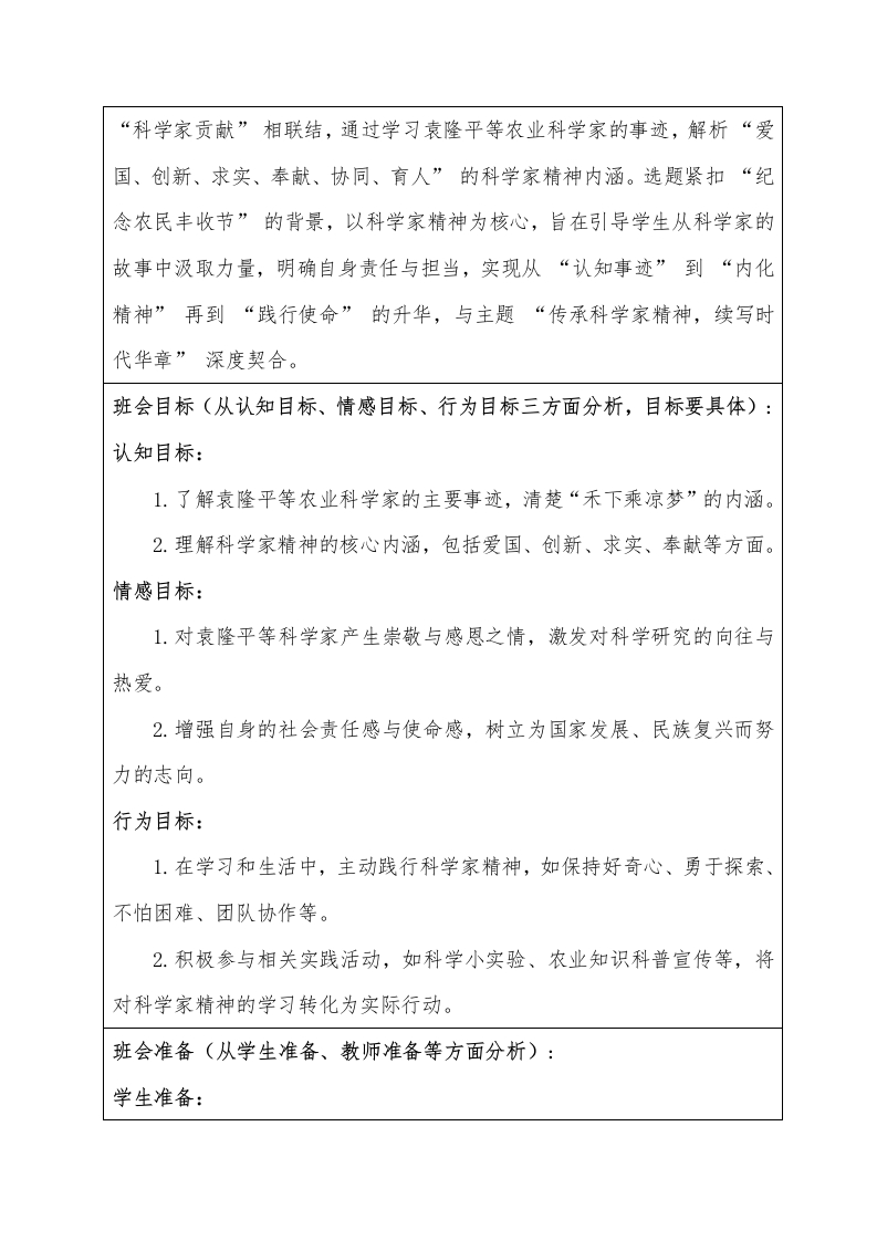 2025-2026学年第一学期班主任基本功大赛暨优秀主题班会设计:禾下乘凉梦,吾辈续华章!晨晨老师2个月前发布关注私信20.15KB9页0457 以下为资料部分截图预览,下载后为超高清原文件。 第1页 / 共9页 第2页 / 共9页 试读已结束,还剩7页,您可下载完整版后进行离线阅读 加入VIP,享海量教务资料,无限制免费下载所有材料 2025-2026学年第一学期班主任基本功大赛暨优秀主题班会设计:禾下乘凉梦,吾辈续华章!此内容为付费资源,请付费后查看¥9.99¥15.99VIP会员免费代理(享70%分佣)免费立即购买您当前未登录!建议登陆后购买,可保存购买订单付费资源© 版权声明文章版权归作者所有,未经允许请勿转载。THE END班级管理 文本预览 2025-2026学年第一学期班主任基本功大赛暨优秀主题班会设计基本信息姓名班级学段学校主题班会题目、背景、目标、准备班会题目禾下乘凉梦,吾辈续华章!一一纪念农民丰收节背后的科学家精神学习主题班会设计背景分析(从学情分析、主题解析两方面分析;主题解析侧重分析班会选题和主题间的关系):学情分析:年级学生处于价值观形成的关键阶段,对“科学家”“精神品质”等抽象概念有一定认知,但缺乏深入、具象的理解。农民丰收节是为农民丰收设立的节日,背后离不开袁隆平等科学家为农业发展、粮食增产所做的巨大贡献。学生虽听闻过袁隆平的事迹,但对其“禾下乘凉梦”等科研理想、长期扎根田间的坚守以及科学家精神的内涵,缺乏系统且深刻的认识。同时,学生具备一定的资料搜集、小组合作与思辨能力,适合开展主题探究与分享活动。主题解析:“禾下乘凉梦”是袁隆平院士对超级杂交水稻高产的美好愿景,代表着科学家对科研理想的执着追求;“吾辈续华章”则呼吁当代青少年传承和弘扬科学家精神。班会选题以“农民丰收节”为契机,将“丰收”与 查看更多 收起部分 喜欢就支持一下吧点赞7 分享QQ空间微博QQ好友海报分享复制链接收藏