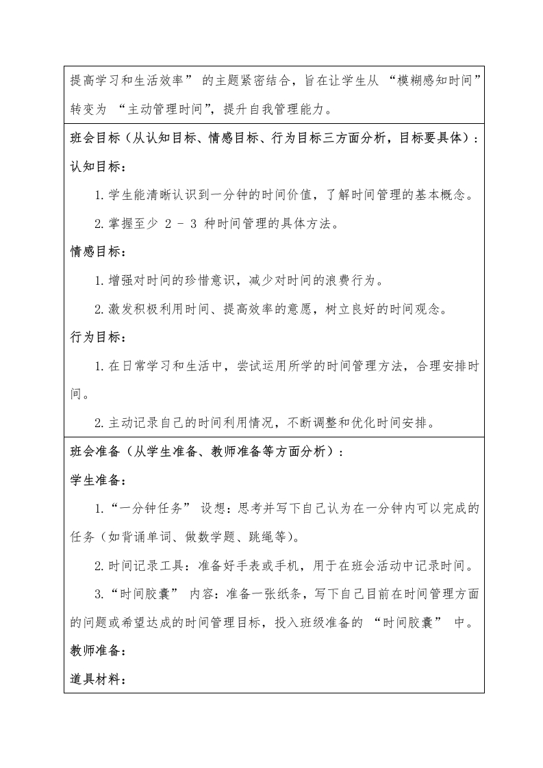 2025-2026学年第一学期班主任基本功大赛暨优秀主题班会设计:一分钟,能做什么?晨晨老师2个月前发布关注私信19.52KB8页0445 以下为资料部分截图预览,下载后为超高清原文件。 第1页 / 共8页 第2页 / 共8页 试读已结束,还剩6页,您可下载完整版后进行离线阅读 加入VIP,享海量教务资料,无限制免费下载所有材料 2025-2026学年第一学期班主任基本功大赛暨优秀主题班会设计:一分钟,能做什么?此内容为付费资源,请付费后查看¥9.99¥15.99VIP会员免费代理(享70%分佣)免费立即购买您当前未登录!建议登陆后购买,可保存购买订单付费资源© 版权声明文章版权归作者所有,未经允许请勿转载。THE END班级管理 文本预览 2025-2026学年第一学期班主任基本功大赛暨优秀主题班会设计基本信息姓名班级学段学校主题班会题目、背景、目标、准备班会题目一分钟,能做什么?一一学生“时间胶囊”体验式时间管理主题班会设计背景分析(从学情分析、主题解析两方面分析;主题解析侧重分析班会选题和主题间的关系):学情分析:学习科目增多,学习任务加重,时间安排开始变得紧张。但他们对时间的感知和管理能力还比较薄弱,常常出现做事拖沓、时间利用效率低的情况,导致学习压力增大,甚至影响学习效果和情绪状态。同时,学生好奇心强,喜欢体验式、互动性强的活动,适合通过实践来学习和掌握时间管理的方法。主题解析:“一分钟,能做什么?”以一个具体的时间单位“一分钟”为切入点,引导学生关注短暂时间的价值,进而延伸到对整体时间的管理。班会选题通过“时间胶囊”这一体验式活动,让学生在实际操作中感受时间的流逝和利用效率,从而理解时间管理的重要性。选题紧扣学生时间管理能力不足的现状,与“帮助学生建立时间观念,掌握基本时间管理方法, 查看更多 收起部分 喜欢就支持一下吧点赞5 分享QQ空间微博QQ好友海报分享复制链接收藏