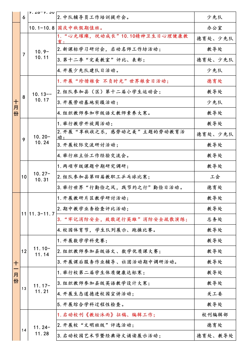 2025-2026秋季学年第一学期学校工作行事历22周晨晨老师2个月前发布关注私信38KB12页02313 以下为资料部分截图预览,下载后为超高清原文件。 第1页 / 共12页 第2页 / 共12页 试读已结束,还剩10页,您可下载完整版后进行离线阅读 加入VIP,享海量教务资料,无限制免费下载所有材料 2025-2026秋季学年第一学期学校工作行事历22周此内容为付费资源,请付费后查看¥9.99¥15.99VIP会员免费代理(享70%分佣)免费立即购买您当前未登录!建议登陆后购买,可保存购买订单付费资源© 版权声明文章版权归作者所有,未经允许请勿转载。THE END全年活动 文本预览 2025-2026学年第一学期学校整体工作计划行事历(本学期共22周)月周份次日期重点工作责任部门1.筹备开学工作,召开中层人员会议、全体教师会议;校长室2.开展全体教师校本培训及新教材培训;散导处3.召开一年级班主任、辅导员岗前培训会:德育处、少先队18.25-8.294.分班、重新编班工作、授课散师课程安排、教材发放;教导处5.各年级部、学科组、授课教师制定工作计划:歌导处6.筹备开学典礼、上好开学第一课:德育处、少先队7.教学物品发放;安全隐患排查,电教设备检修。德育处、总务处1.举行“烽火记忆照前路,秋风为序启新程”开学典礼:少先队2.开展“弘扬抗战精神,强国复兴有我”主题教育活动:德育处、少先队3.召开一年级新生入学家长会;教导处29.1-9.53.“积跬步,养习惯,向未来”好习惯教育;德育处、少先队4.“青蓝工程”帮扶结对工程启动:散导处5.做好上级教育主管部门开学暨校园安全工作督查工作。校长室份1.开展“礼赞教师节,浓浓尊师意”第41个教师节活动:工会2.开展第十届最美教师评选表乾暨师德师风主题教育活动:工会39.8-9.123.书香校园读书节启动仪式:教导处4.2025年新进教师课堂教学展示课;散导处5.学期初教学业务、班主任工作检查。教导处1.开展第27届推普周活动;德育处、教导处2.组织教师参加县级语文教师素养大赛:49.15-9.193.启动随堂听课、教师考评课活动:教导处4.展开预防电信诈骗主题教育活动。散导处1.国际和平日主题班会活动:德育处、少先队59.22-9.262.筹备教学开放周活动:教导处3.开展防校园欺凌主题教育。德育处1“盛世欢歌迎国庆,同心共筑新时代”国庆76周年活动;少先队、工会0n0_0n 查看更多 收起部分 喜欢就支持一下吧点赞13 分享QQ空间微博QQ好友海报分享复制链接收藏