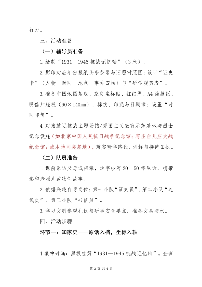 2025年少先队活动课案例,从小家到大家红领巾探访抗战记忆晨晨老师2个月前发布关注私信0.35MB6页04113 以下为资料部分截图预览,下载后为超高清原文件。 第1页 / 共6页 第2页 / 共6页 试读已结束,还剩4页,您可下载完整版后进行离线阅读 加入VIP,享海量教务资料,无限制免费下载所有材料 2025年少先队活动课案例,从小家到大家红领巾探访抗战记忆此内容为付费资源,请付费后查看¥9.99¥15.99VIP会员免费代理(享70%分佣)免费立即购买您当前未登录!建议登陆后购买,可保存购买订单付费资源© 版权声明文章版权归作者所有,未经允许请勿转载。THE END活动方案 文本预览 2025年少先队活动课案例一从小家到大家·红领巾探访抗战记忆(抗战胜利80周年主题)一、活动背景八十年,是“山河无恙”的分寸,也是“家国同心”的刻度。四、五、六年级的少先队员,正从图像化感受走向初步抽象。他们需要在“可触可感”的情境里,把一本家的家书、一座城的桥、一块碑上的名字,连成中国抗战的年轮。《少先队活动课程指导纲要(2021年版)》明确:少先队活动课以实践教育为基本形式,突出政治性与组织性,重视过程性与发展性评价,鼓励校内外协同育人。我们据此设计“知家史一访家国一传家史一向大家”四环递进,让孩子在真实场域与真实行动中,识历史、长本领、立志向。二、活动目标政治启蒙:能将至少1条家庭原话与抗战关键节点准确对应,理解胜利的历史意义与当下责任。组织认同:在小队岗位(证史员/连线员/书信员)中完成协作、协商与互评,增强组织归属。道德养成:在文明参观、祭奠与口述回访中,形成尊重事实、尊重亲历者与尊重公共秩序的品格。全面发展:在报章互证、地图连线、口述整理、公共讲解与研学观察中,提升信息整合、叙述表达、审美制作与项目执第1页共6页 查看更多 收起部分 喜欢就支持一下吧点赞13 分享QQ空间微博QQ好友海报分享复制链接收藏