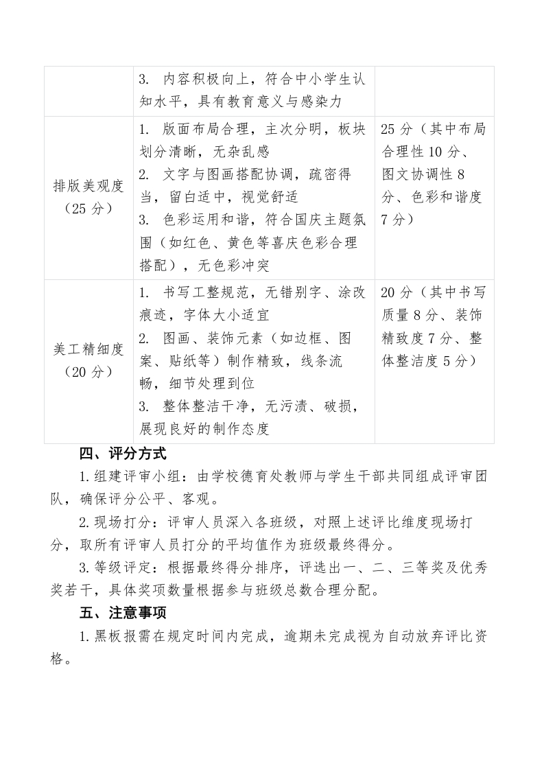 “板上绘初心・班徽映国潮”——2025年中小学国庆主题黑板报评比细则晨晨老师2个月前发布关注私信19.89KB3页02410 以下为资料部分截图预览,下载后为超高清原文件。 第1页 / 共3页 第2页 / 共3页 试读已结束,还剩1页,您可下载完整版后进行离线阅读 加入VIP,享海量教务资料,无限制免费下载所有材料 “板上绘初心・班徽映国潮”——2025年中小学国庆主题黑板报评比细则此内容为付费资源,请付费后查看¥9.99¥15.99VIP会员免费代理(享70%分佣)免费立即购买您当前未登录!建议登陆后购买,可保存购买订单付费资源© 版权声明文章版权归作者所有,未经允许请勿转载。THE END综合资料 文本预览 “板上绘初心·班徽映国潮”2025年中小学国庆主题黑板报评比细则一、评比对象全体班级二、评比时间1.作品完成时间:2025年9月28日-9月30日2.现场评比时间:2025年9月30日下午三、评比维度及分值评比维度具体要求分值(总分100分)1.紧扣“国庆”核心主题,内容围30分(其中主题绕国庆知识、爱国精神、时代风貌紧扣度12分、展开,无偏离主题内容理念融入度10主题契合度2.融入“山河颂华诞·少年承荣分、主题清晰度(30分)光”活动整体理念,体现中小学生8分)对祖国的热爱与祝福3.主题表达清晰明确,能让观者快速把握核心思想1.内容涵盖国庆相关元素,如国庆25分(其中信息节由来、祖国发展成就、红色故完整性10分、内容丰富度事、爱国名言等,信息详实班级特色融入8(25分)2.结合班级特色,融入班级文化或分、内容正向性学生成长感悟,体现班级独特视角7分) 查看更多 收起部分 喜欢就支持一下吧点赞10 分享QQ空间微博QQ好友海报分享复制链接收藏