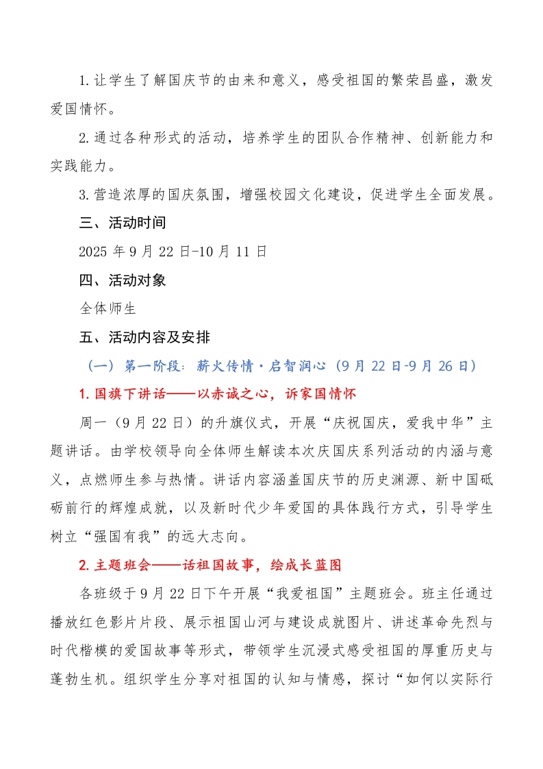 “山河颂华诞・少年承荣光”——2025年中小学国庆节系列活动策划案晨晨老师2个月前发布关注私信24.62KB8页0277 以下为资料部分截图预览,下载后为超高清原文件。 第1页 / 共8页 第2页 / 共8页 试读已结束,还剩6页,您可下载完整版后进行离线阅读 加入VIP,享海量教务资料,无限制免费下载所有材料 “山河颂华诞・少年承荣光”——2025年中小学国庆节系列活动策划案此内容为付费资源,请付费后查看¥9.99¥15.99VIP会员免费代理(享70%分佣)免费立即购买您当前未登录!建议登陆后购买,可保存购买订单付费资源© 版权声明文章版权归作者所有,未经允许请勿转载。THE END综合资料 文本预览 “山河颂华诞·少年承荣光”2025年中小学国庆节系列活动策划案活动内容(一)第一阶段:薪火传情·启智润心(9月22日-9月26日)(二)第二阶段:艺彩绘心·实践践情(9月28日-10月7日)(三)第三阶段:凝心总结·逐光前行(10月9日-10月11日)一、活动背景九州同庆迎华诞,万里山河展新颜。当岁月的年轮镌刻至中华人民共和国成立76周年的重要节点,我们见证了祖国从站起来、富起来到强起来的壮阔征程一一从大漠戈壁的航天发射塔架,到碧波万顷的深海探测航船;从乡村振兴的田间地头,到科技创新的前沿阵地,每一处发展印记都闪耀着奋斗的光芒。国庆节作为承载民族记忆、凝聚家国情怀的重要节日,不仅是礼赞祖国成就的时刻,更是引导青少年厚植爱国根脉、筑牢信仰之基的关键契机。为让中小学生在节日氛围中感悟祖国的繁荣昌盛,在沉浸式体验中激发爱国热情与民族自豪感,在实践参与中提升综合素质、涵养责任担当,同时进一步丰富校园文化生活,为校园注入浓厚的家国情怀与时代气息,特精心策划本次庆国庆系列活动方案。二、活动目标 查看更多 收起部分 喜欢就支持一下吧点赞7 分享QQ空间微博QQ好友海报分享复制链接收藏